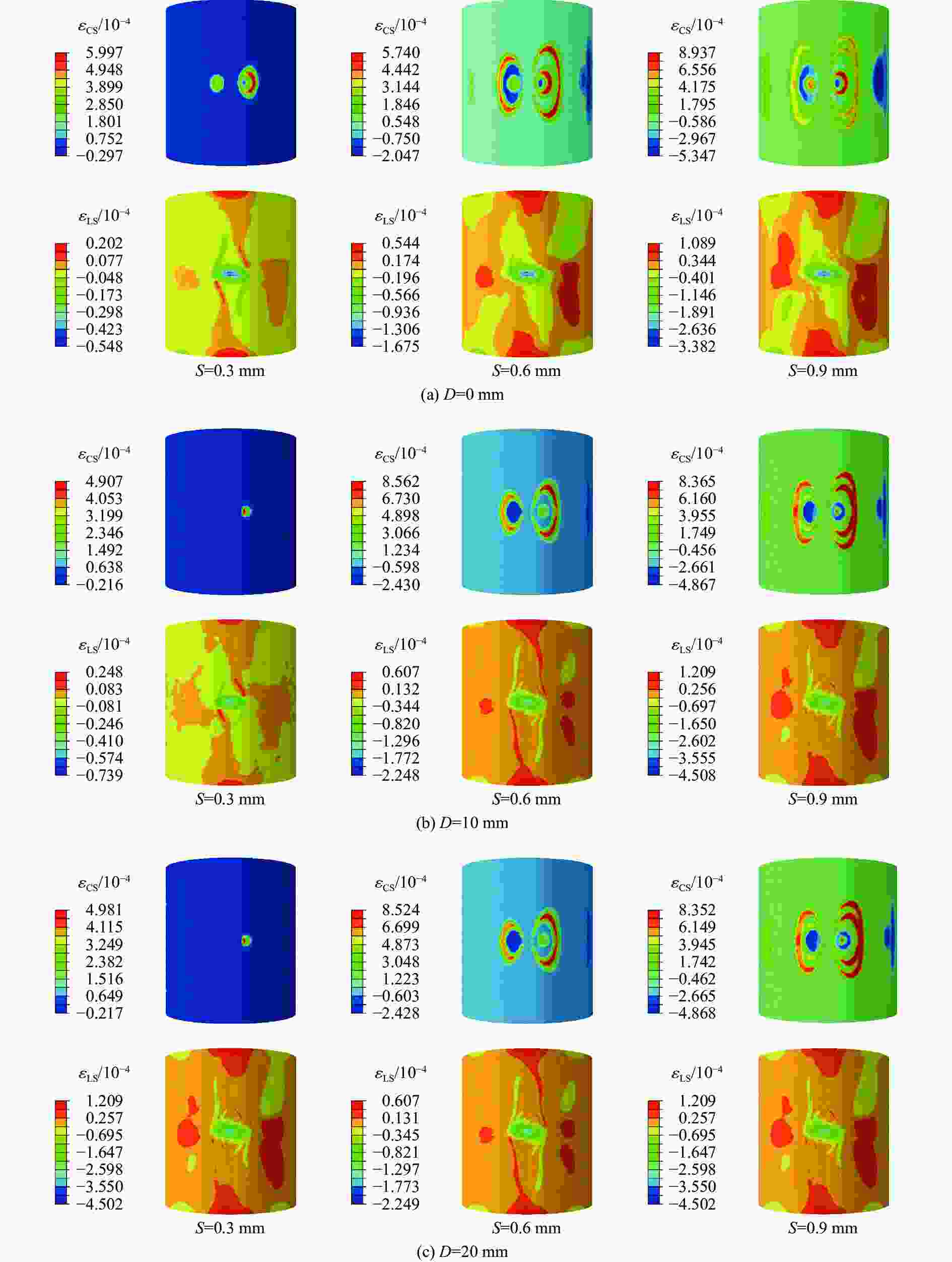 图  含有不同尺寸分层缺陷复合材料压力容器的应变云图