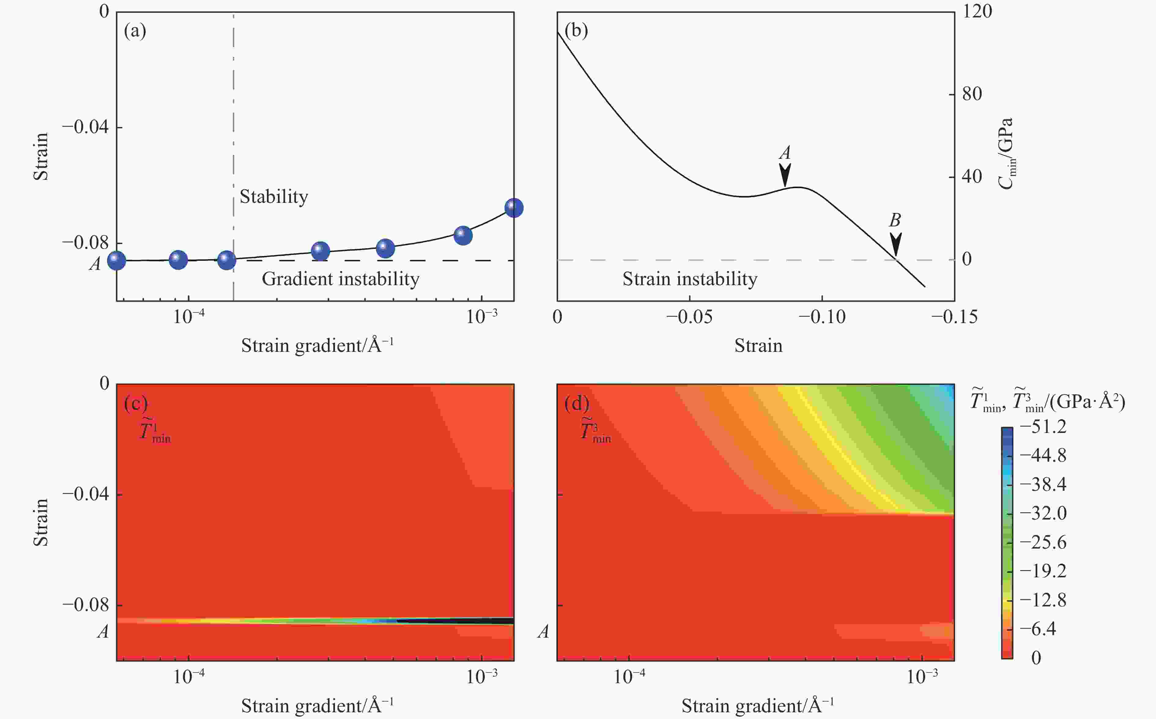 $ \widetilde {{{B}}} $ 的最小本征值(Cmin)随单轴应变的变化;(c)~(d)分别以$ {\widetilde {T}}_{\rm{min}}^{1} $ 和$ {\widetilde {T}}_{\rm{min}}^{3} $ 表示的应变-应变梯度空间中的等高图($ {\widetilde {T}}_{\rm{min}}^{1} $ 和$ {\widetilde {T}}_{\rm{min}}^{3} $ 分别为$ \widetilde {{T}} $ 沿x和z方向分量的最小本征值,图中所有的A对应于相同的应变)[62]Figure 12. (a) Critical instability strain versus strain gradient under ramp compressions; (b) minimumeigenvalue of