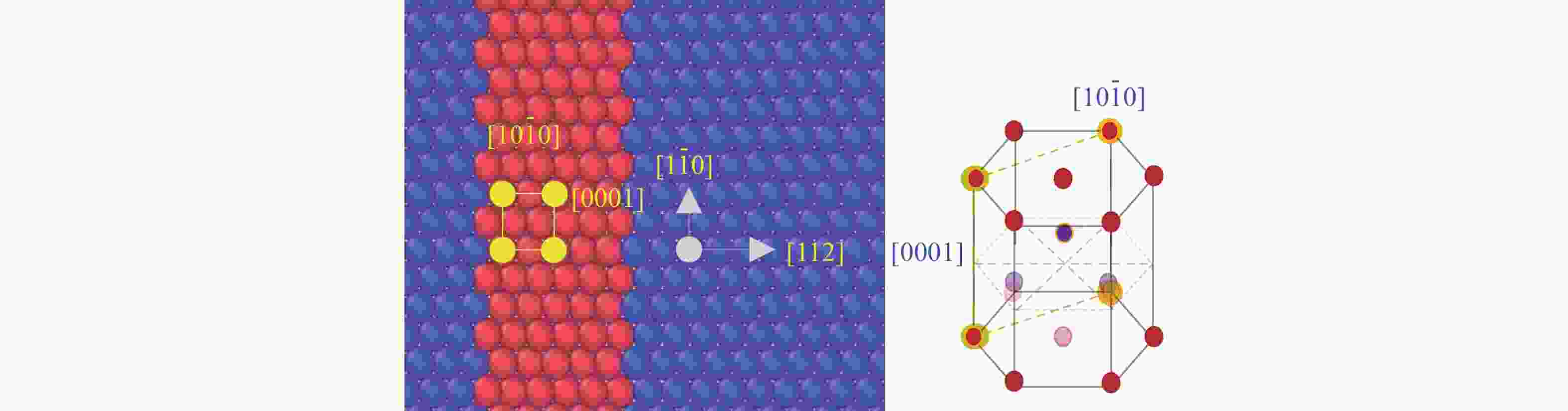$ \widetilde {{{B}}} $ versus uniaxial strain; (c) and (d) are the contour plot$ {\widetilde {T}}_{\rm{min}}^{1} $ and$ {\widetilde {T}}_{\rm{min}}^{3} $ in the strain vs. strain gradient space, where$ {\widetilde {T}}_{\rm{min}}^{1} $ and$ {\widetilde {T}}_{\rm{min}}^{3} $ are the minimum eigenvalue of the x- and z-component of$ \widetilde {{T}} $ (In the figures, “A” corresponds to the same strain.)[62]图 16 含有孪晶的双晶铁样品在最大粒子速度为0.4 km/s的斜波压缩下31 ps时的局部构型(红色表示hcp原子,蓝色表示bcc原子,右图hcp晶胞中黄色的原子面对应于左图中黄色方框标记的原子面)[74]