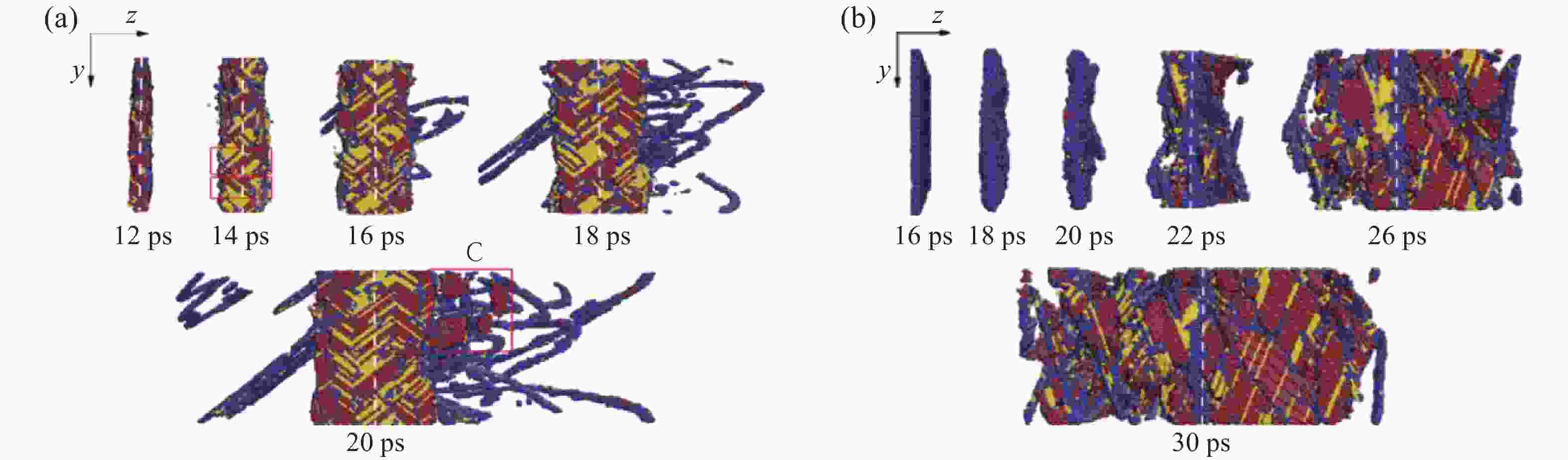 $\varSigma3$ 扭转晶界(a)与$\varSigma3$ 倾斜晶界(b)的冲击塑性与相变(冲击波沿z方向传播,在两种样品中分别对应于<110>和<111>晶向)[75]Figure 17. Shock-induced plasticity and phase transition of