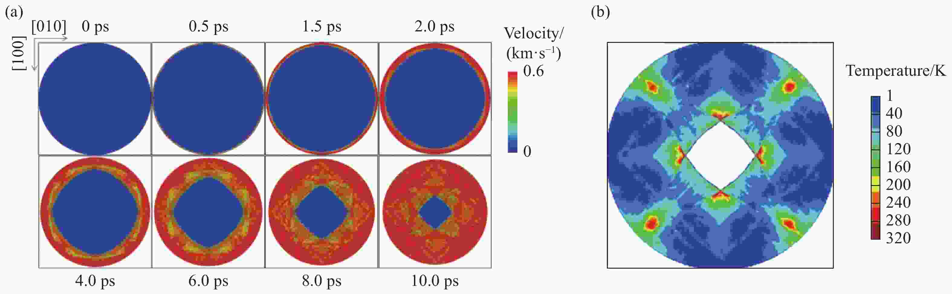 图 22 (a)柱面轴沿单晶Fe [001]晶向在内爆冲击下垂直于柱面轴的横截面内的原子速率分布,(b)10 ps时垂直柱面轴横截面内的局域温度分布