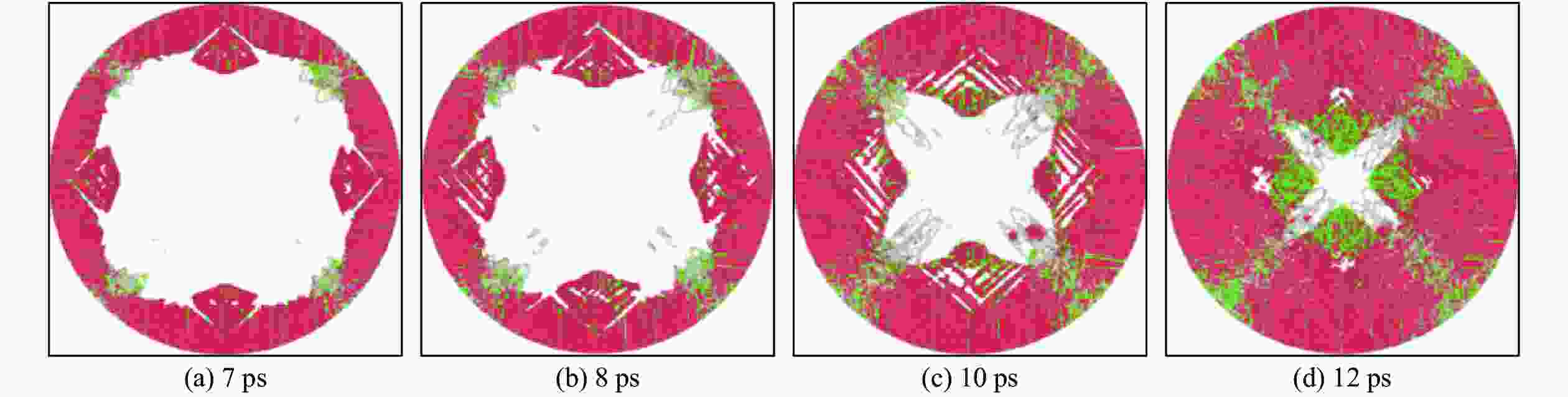 图 23 柱面轴沿单晶Fe [001]晶向在内爆冲击下(vp = 0.6 km/s)局域微结构随时间的演变(红色表示hcp结构原子,绿色表示以层错形式出现的fcc结构原子,灰色表示位错线周围的其他结构类型的原子,为清晰起见,未相变的bcc结构原子已被删除)