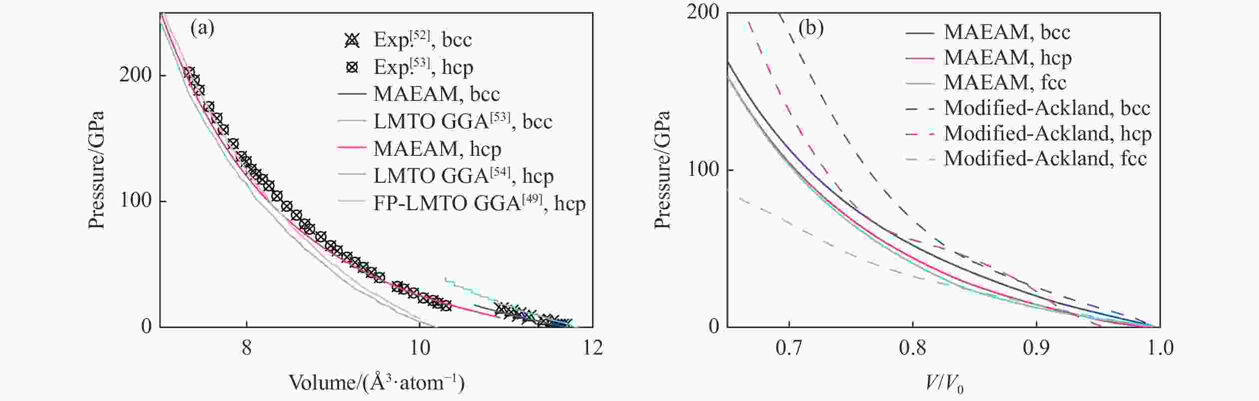 图 3 (a) MAEAM势预测的物态方程与实验及第一原理计算结果的对比,(b) 采用MAEAM势与改进的Ackland势的计算结果对比[49, 52-54]