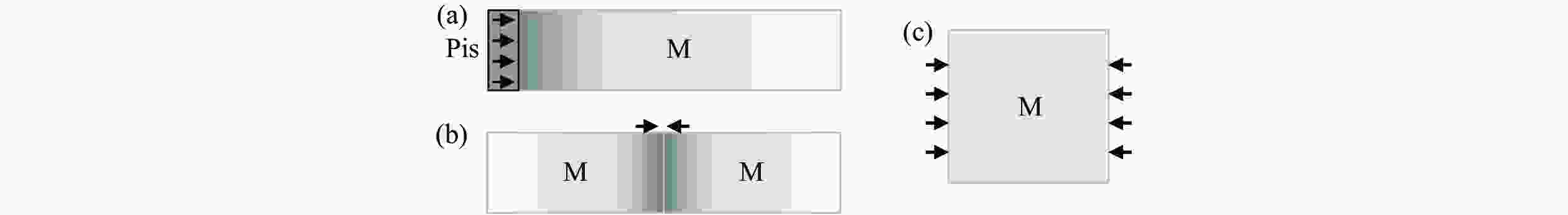 图 6 实现高应变率加卸载的3种方法:(a)活塞加载,(b)对称撞击,(c)均匀单轴压缩(“M”表示材料,箭头表示活塞或材料的运动方向,灰色梯度表示材料受到碰撞时形成的冲击波)