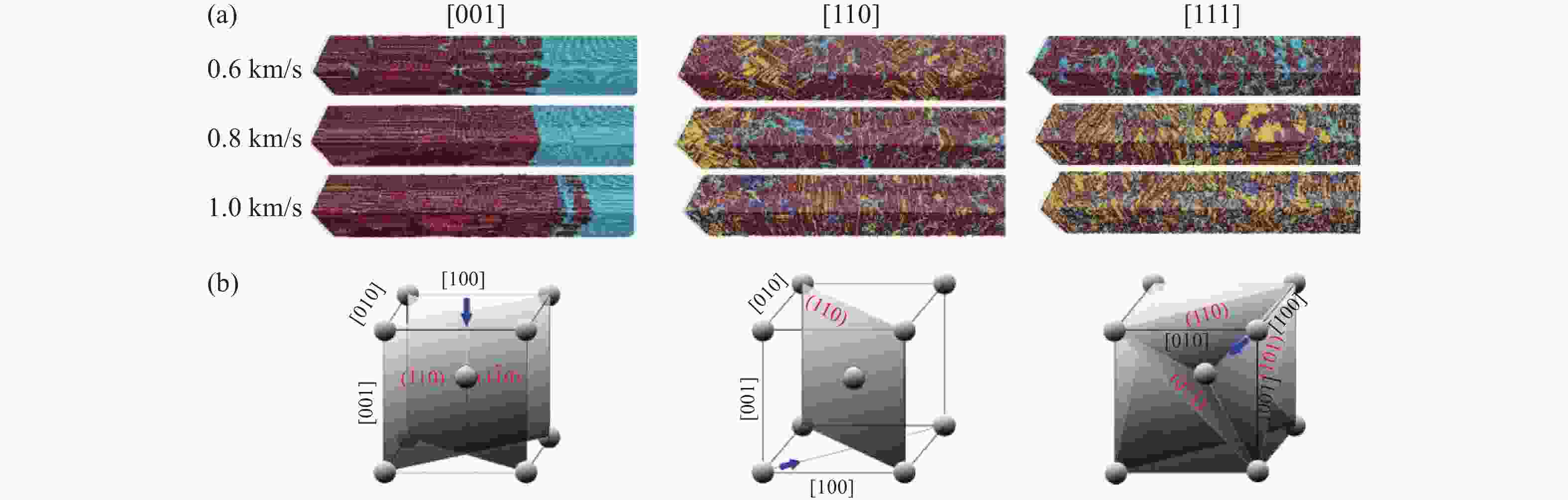 Figure 8. (a) Phase transition of single crystalline iron under different shock directions and shock strength (The meaning of the colors is: red (hcp atoms), yellow (fcc atoms), light blue (bcc atoms) and dark blue (defects).); (b) relationship between the shock direction and habit plane[34]
