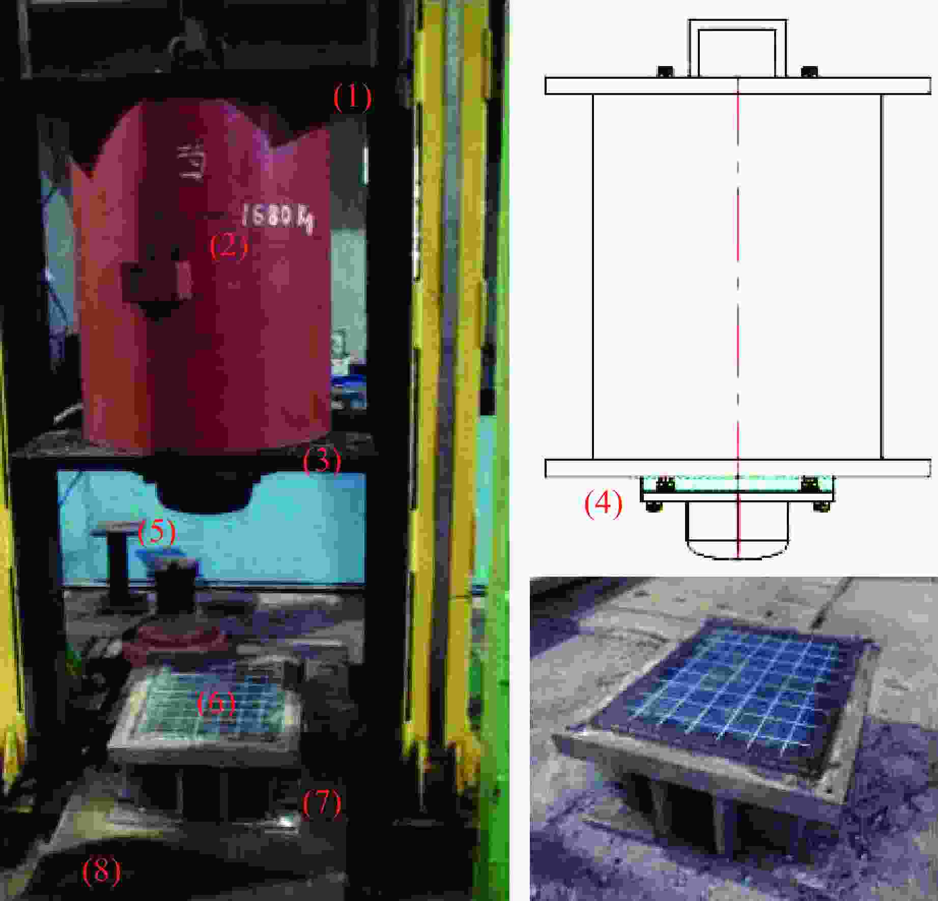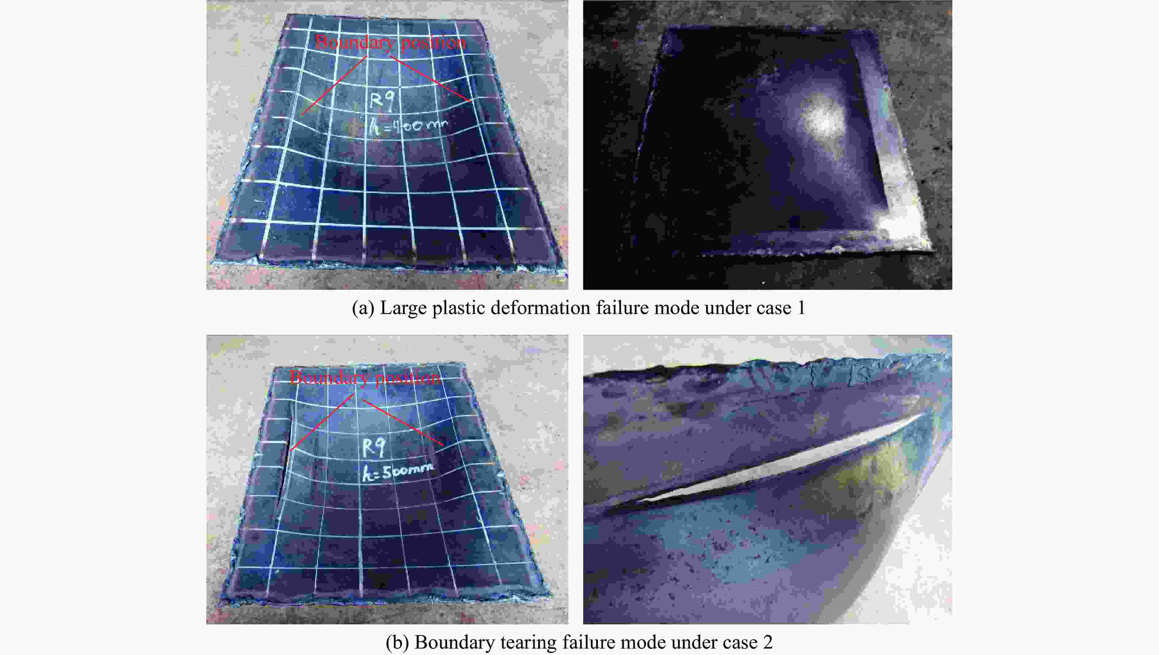 Case h/m v/(m·s−1) M/kg E/kJ Result D/mm Damage 1 0.4 2.80 2 024 7.934 39.3 Plastic deformation 2 0.5 3.13 2 024 9.917 45.9 Boundary tearing 3 0.6 3.42 2 024 11.901 48.6 Boundary tearing 4 0.7 3.70 2 024 13.884 55.8 Boundary tearing -