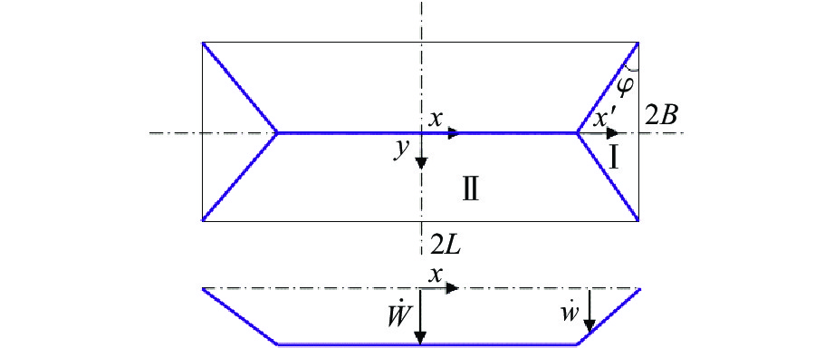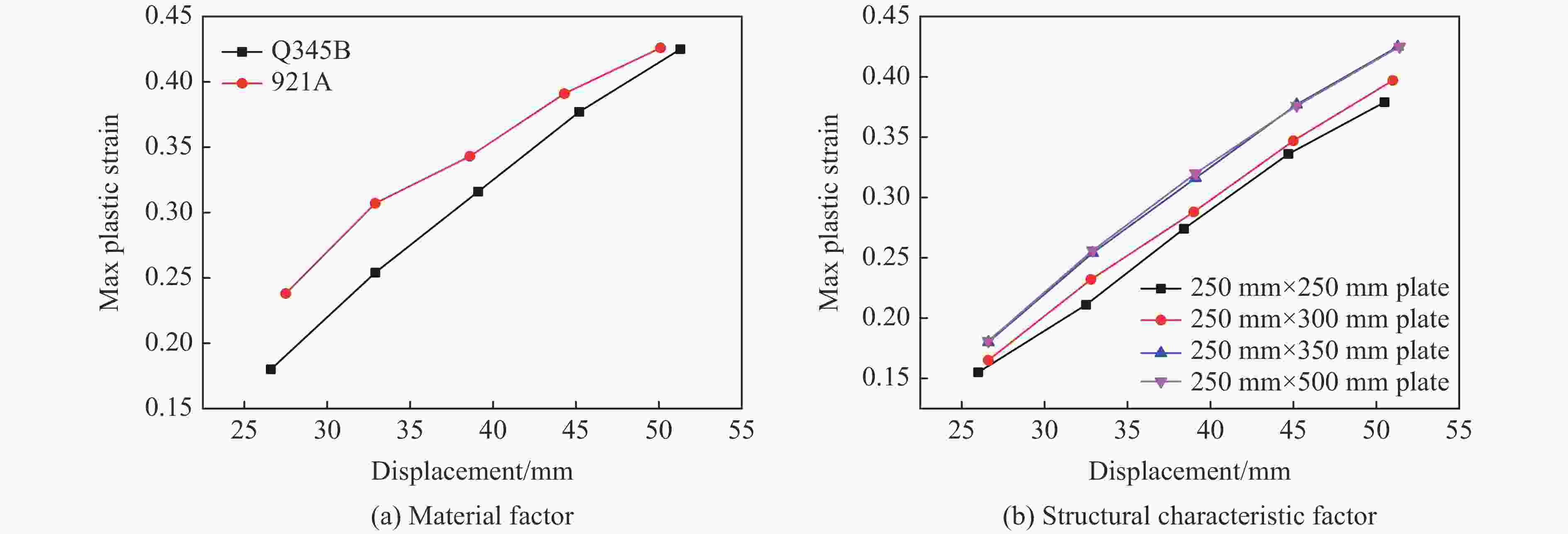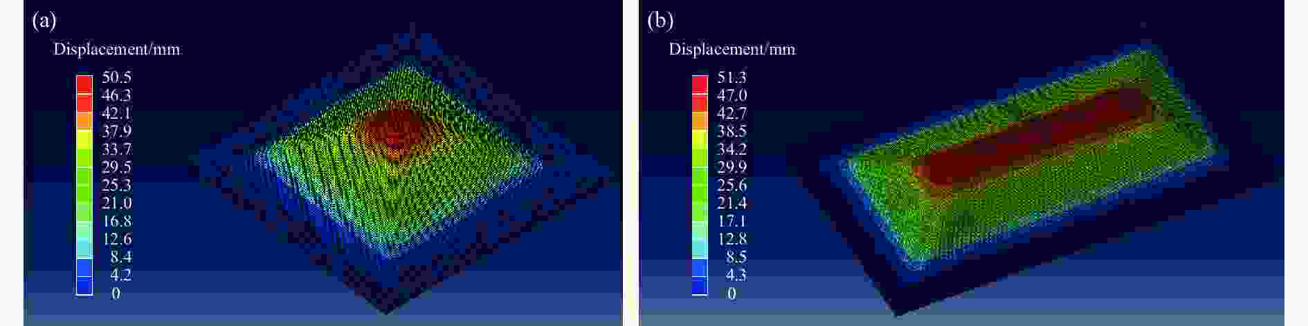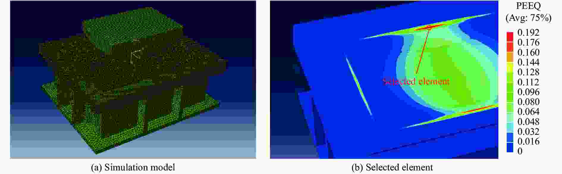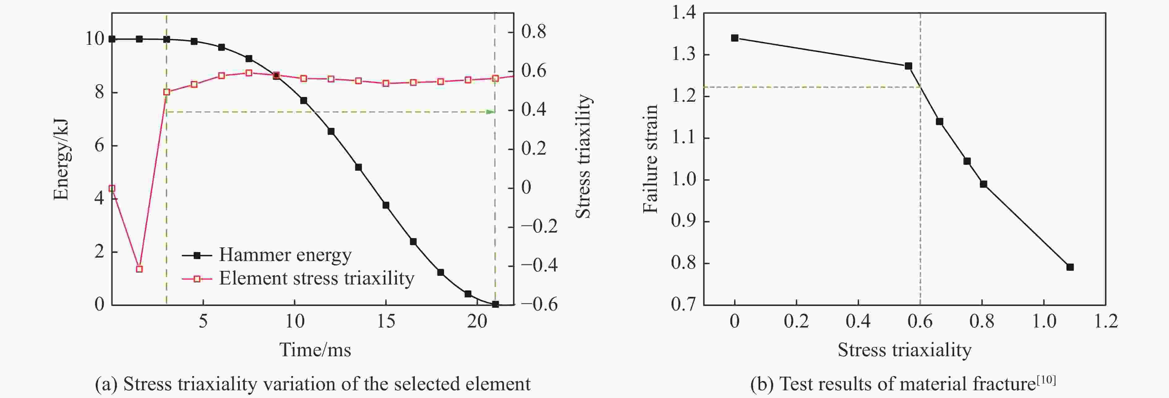 摘要: 为探究大尺度锤头冲击下固支方板的动响应行为,结合落锤工装设计了大尺度冲击锤头,通过对固支方板开展不同冲击强度下的撞击试验,获取了固支方板在大尺度锤头撞击下的典型破坏模式。同时依据试验结果及冲击动力学理论,建立了大尺度锤头冲击下固支方板变形评估方法,并结合数值模拟建立了大尺度锤头冲击下方板边界撕裂判据。研究结果表明:大尺度锤头冲击下固支方板主要依靠边界塑性铰、面板内塑性铰耗能,固支方板的撕裂从边界位置开始。基于塑性铰耗能机制建立了方板塑性变形理论评估方法,理论计算结果与试验结果吻合较好。固支方板撕裂过程中,边界起始撕裂处应力三轴度基本在0.6左右,本试验中建立的临界失效判据Bh值可取1.6倍板厚。所建立的评估方法及失效判据进一步完善了落锤冲击下固支方板的动响应行为研究。Abstract: In order to investigate the dynamic response behavior of clamped square plates under the impact of the large-scale hammer, a large-scale hammer head was designed in combination with the drop hammer tooling. The impact tests of clamped square plates under different impact strength were carried out, and the typical failure modes of clamped square plates under the impact of large-scale hammer were obtained. Based on the experimental results and the impact dynamics theory, the deformation evaluation method of clamped square plates under the impact of large-scale hammer was established. In addition, the boundary tearing criterion of clamped square plates was established by combining simulation analysis. The results indicated that the energy dissipation of clamped square plates under the impact of the large-scale hammer mainly depended on the plastic hinge and in-plane plastic hinge, and the initial tearing firstly occurred in plate boundary. Moreover, the plastic deformation evaluation method of clamped square plates established by the plastic hinge energy dissipation mechanism was in good agreement with the experiment results. In addition, the value of the stress triaxiality at the initial tearing position was nearly 0.6 during the tearing process of the clamped square plates. According to failure criterion established in this paper, the value of Bh was 1.6 times plate thickness. The evaluation method and failure criterion presented in this paper further improve the research on the dynamic response behavior of clamped square plates under the impact of the large-scale hammer.