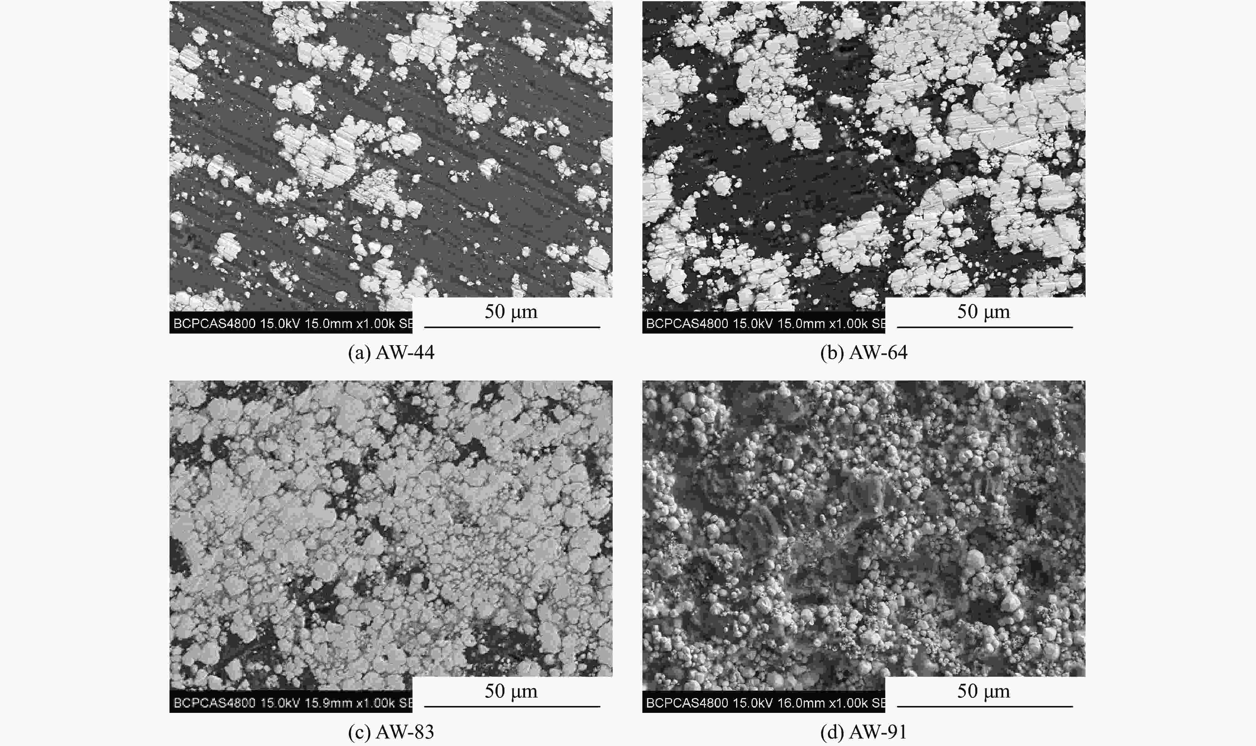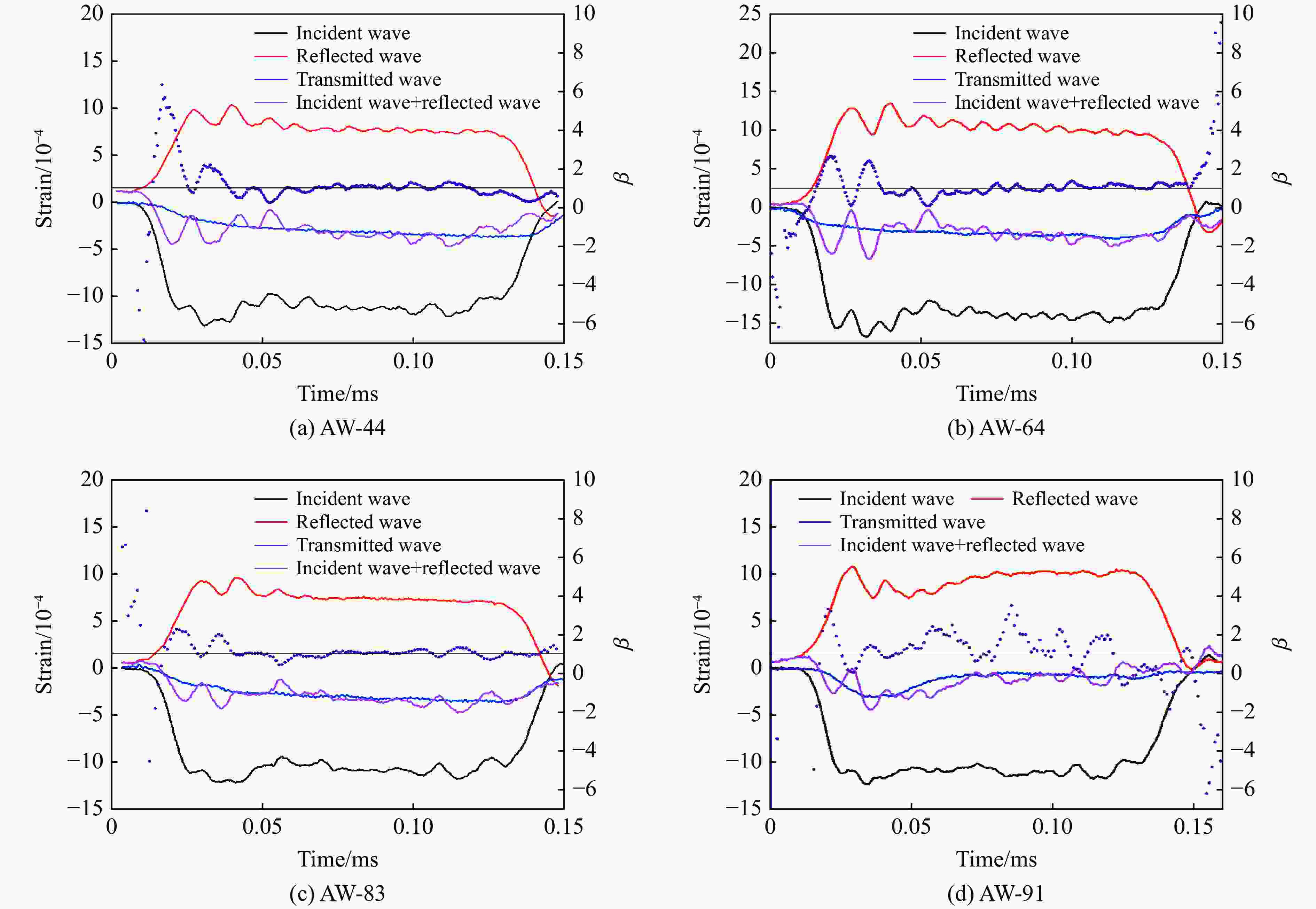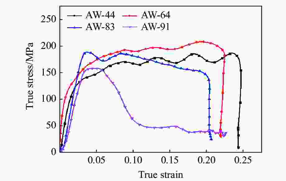 Test No. Specimen code Mass fraction of W/% Density/(kg·m−3) Volume porosity/% 1 AW-44 44 3740 14.5 2 AW-64 64 4950 18.1 3 AW-83 83 6860 27.7 4 AW-91 91 8370 32.9 表 2 不同配比Al/W试件的动态压缩力学性能