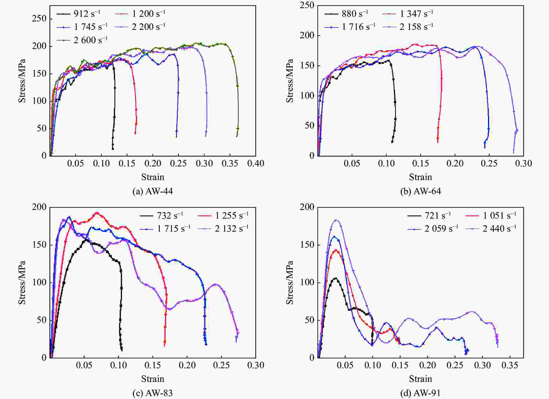 Material Strain rate/s−1 Dynamic compression yield strength/MPa AW-44 1745 137.2 AW-64 1716 168.2 AW-83 1715 187.4 AW-91 1770 157.7 (failure strength) -
