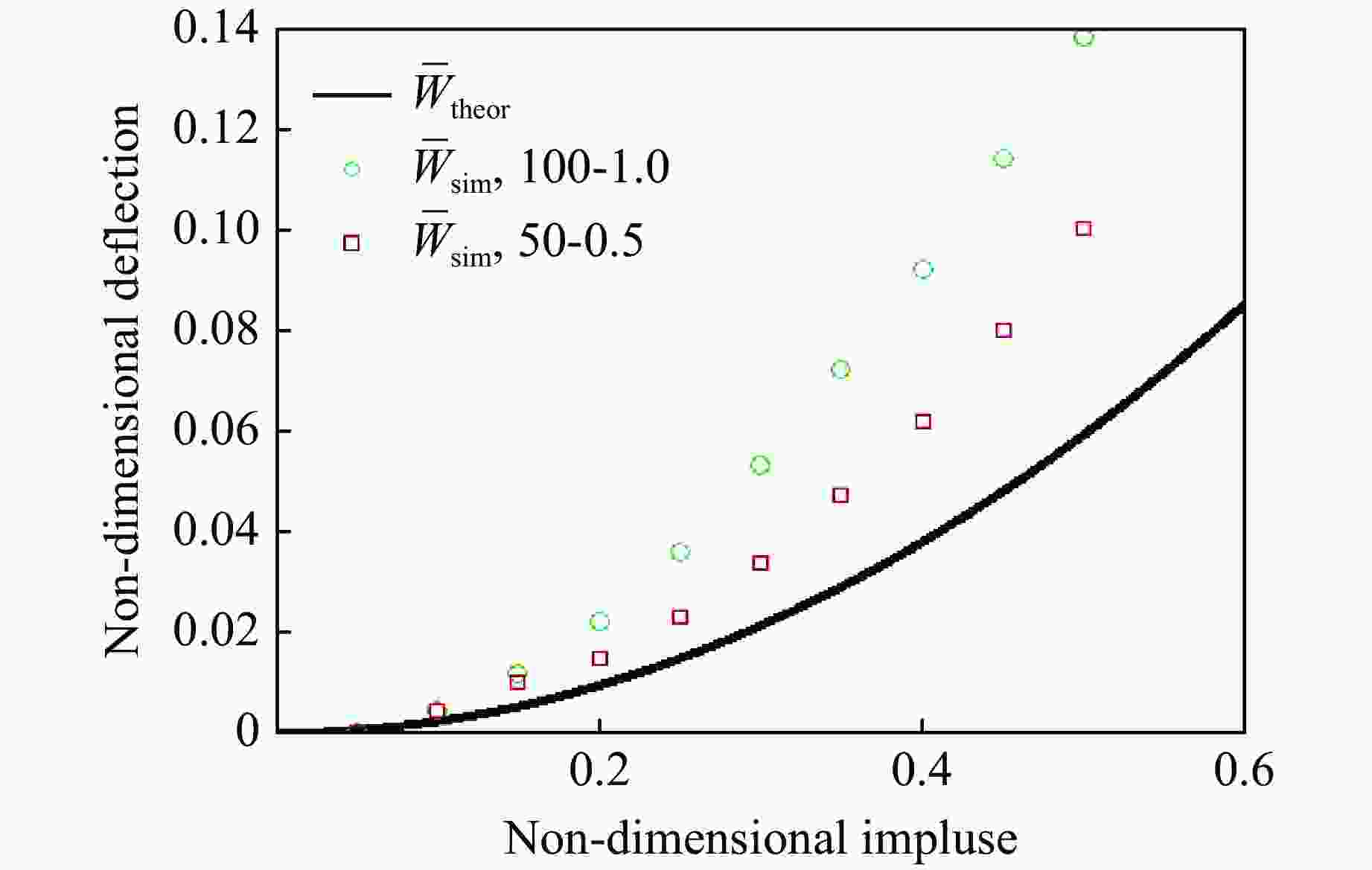 图  不同无量纲冲量下无量纲挠度的理论解与数值模拟结果的对比