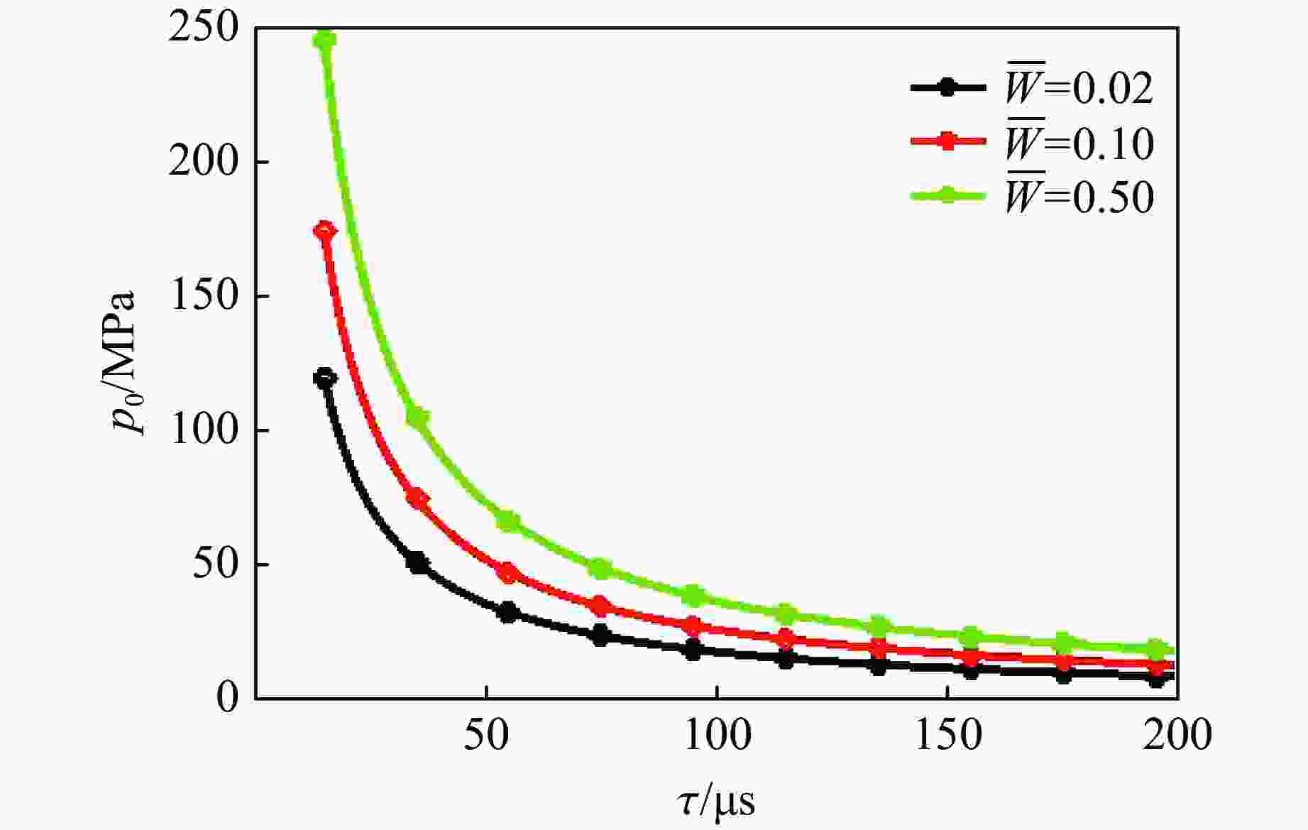 Figure  8.  Curves of peak explosive load ${p_0}$ vs. characteristic time constant $\tau $
