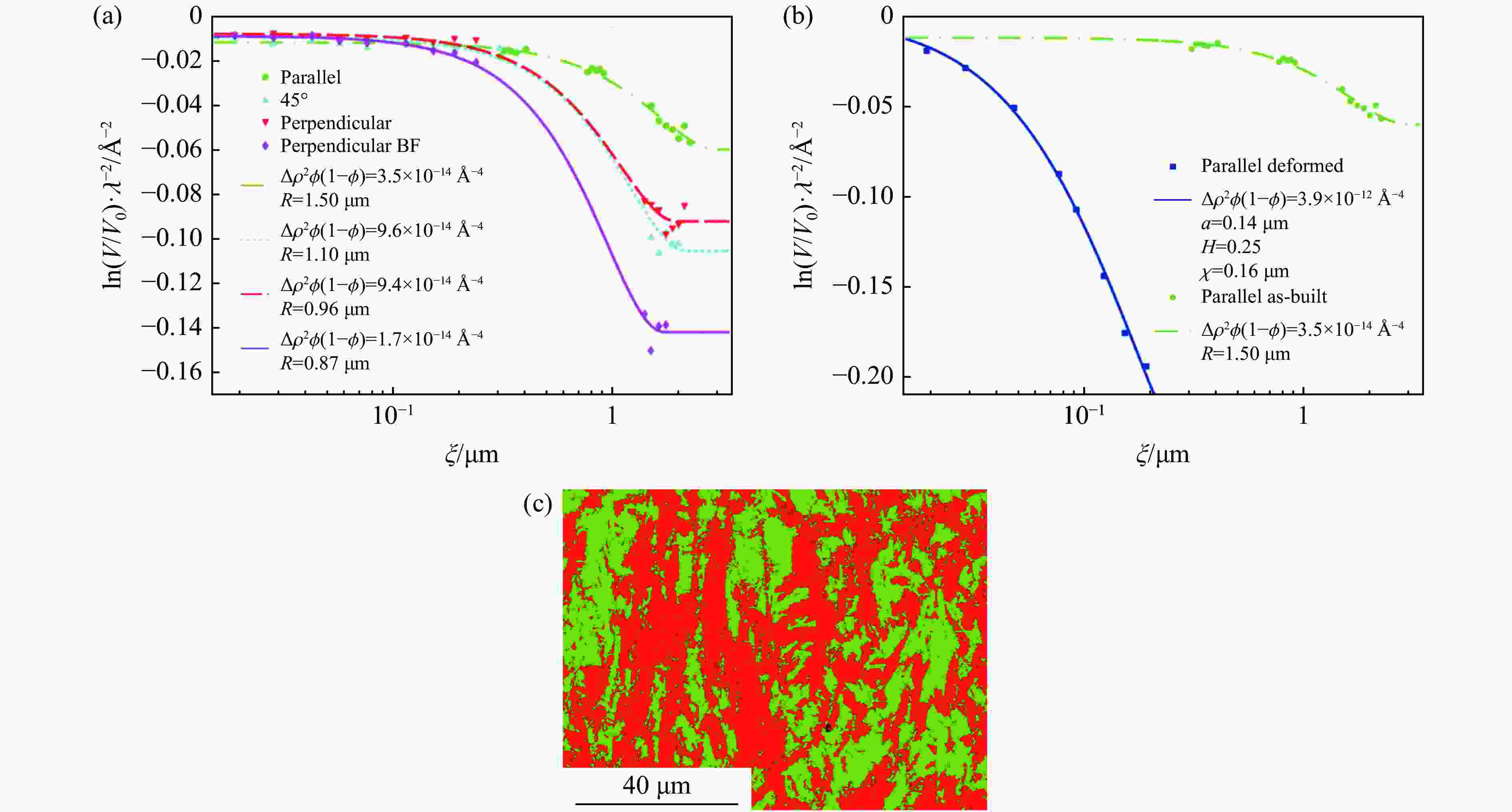 Figure  11.  Measured data (points) and theoretical models (lines) assuming a random two phase medium model for the as-built (a) and deformed (b) samples, (c) phase image after impacting (Red represents austenitic phase, and green represents martensitic phase.)[82]