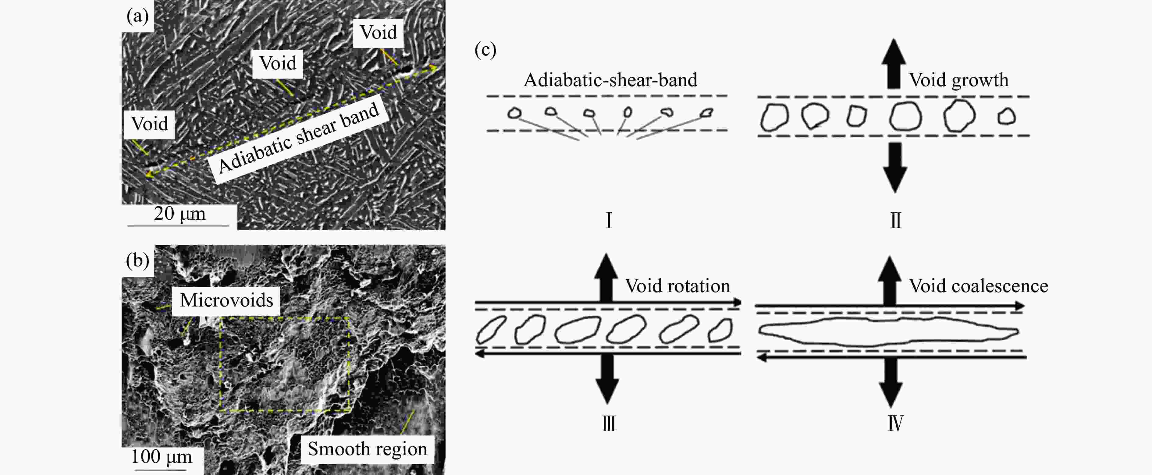 图  12  冲击载荷下EBM成型Ti-6Al-4V合金中的微孔洞形貌:(a) 剪切带中的微孔洞,(b) 断面中的微孔洞,(c) 微孔洞形成机理[41]