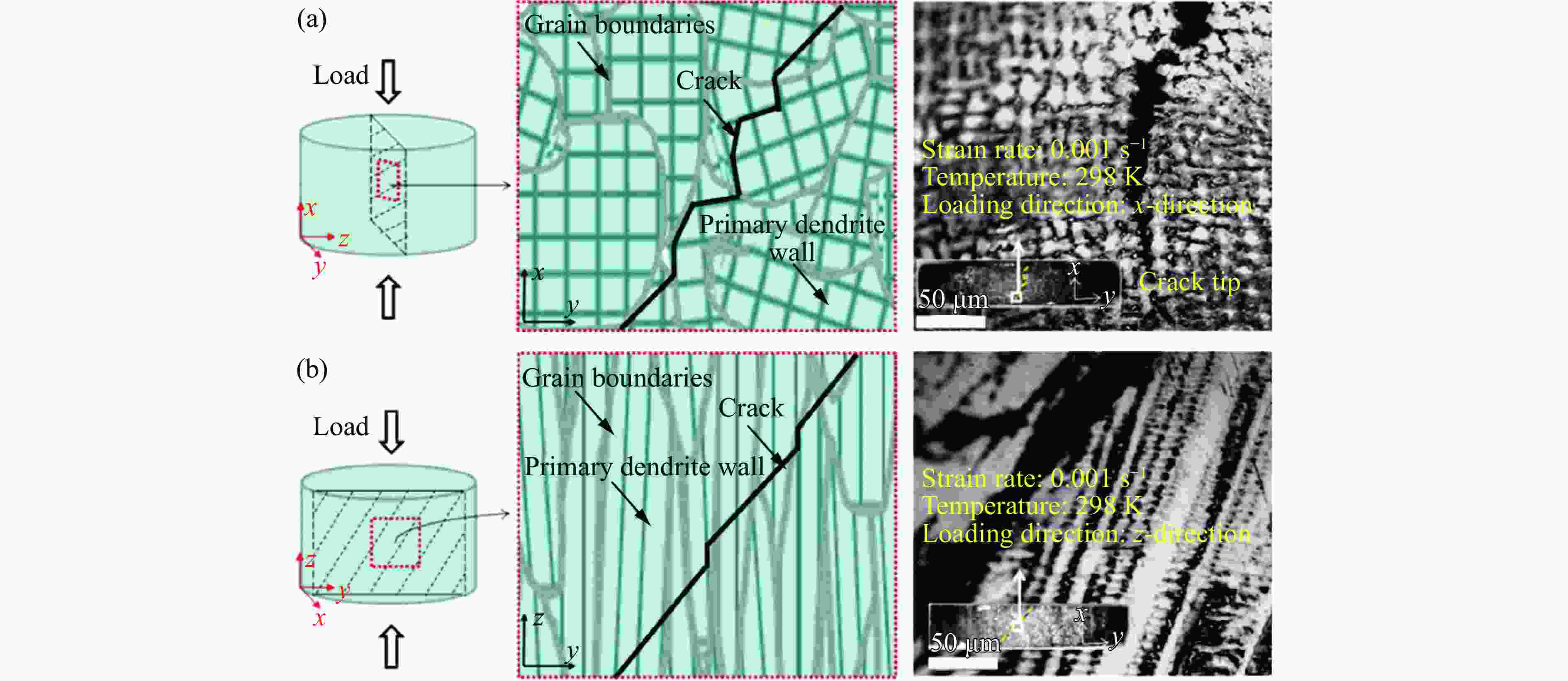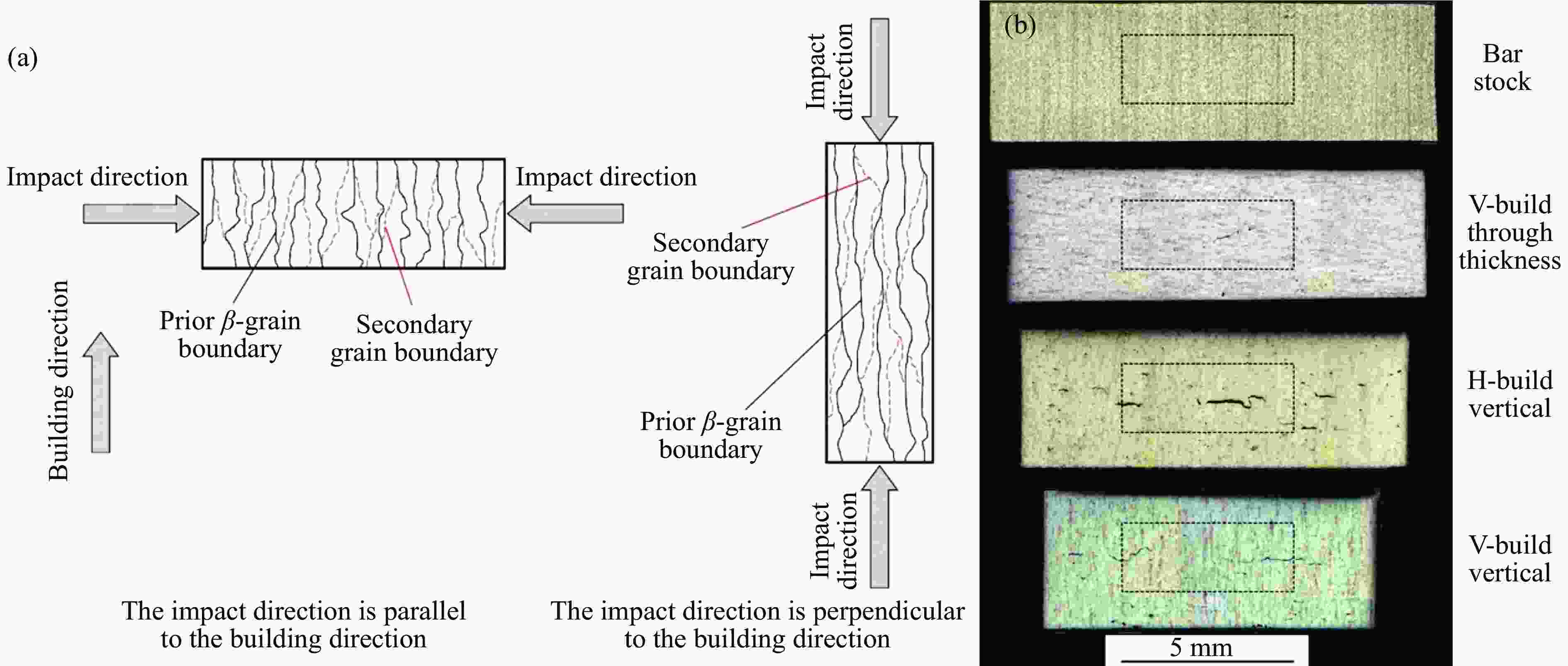 图  (a)加载方向与晶粒方位示意图[40],(b)不同成型方向的SLM成型Ti-6Al-4V合金冲击后的形貌[44]