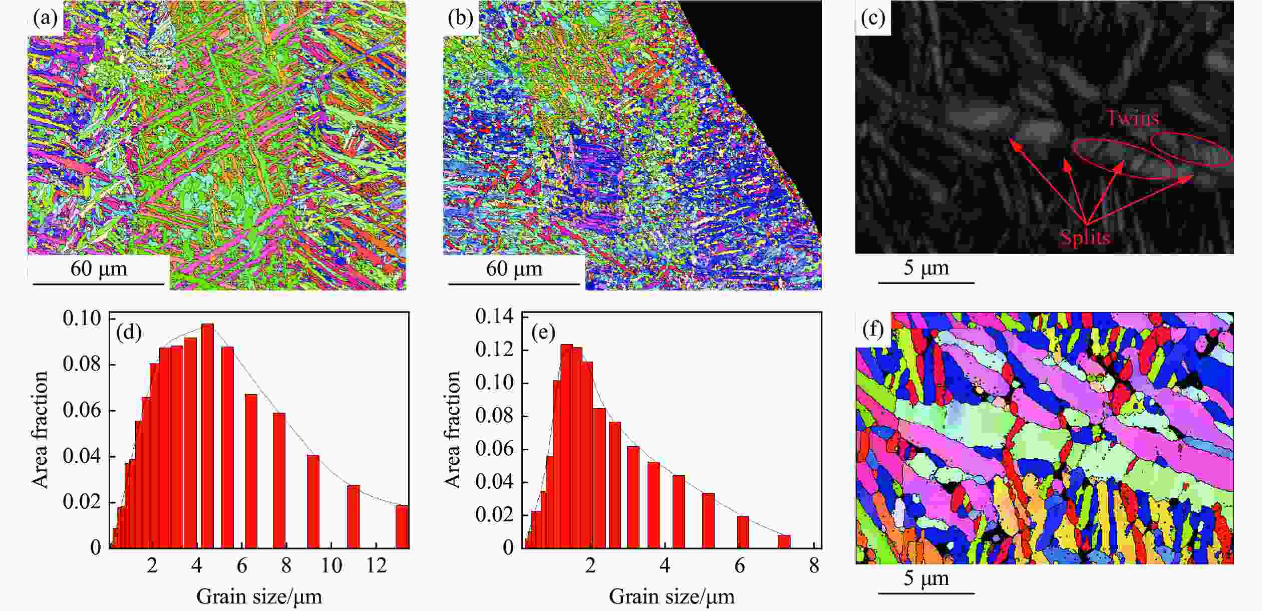图  SLM成型Ti-6Al-4V钛合金的反极图及晶粒尺寸统计:(a)和(d)为原始材料,(b)和(e)为冲击加载后的样品,(c)和(f)为冲击加载后样品的放大图