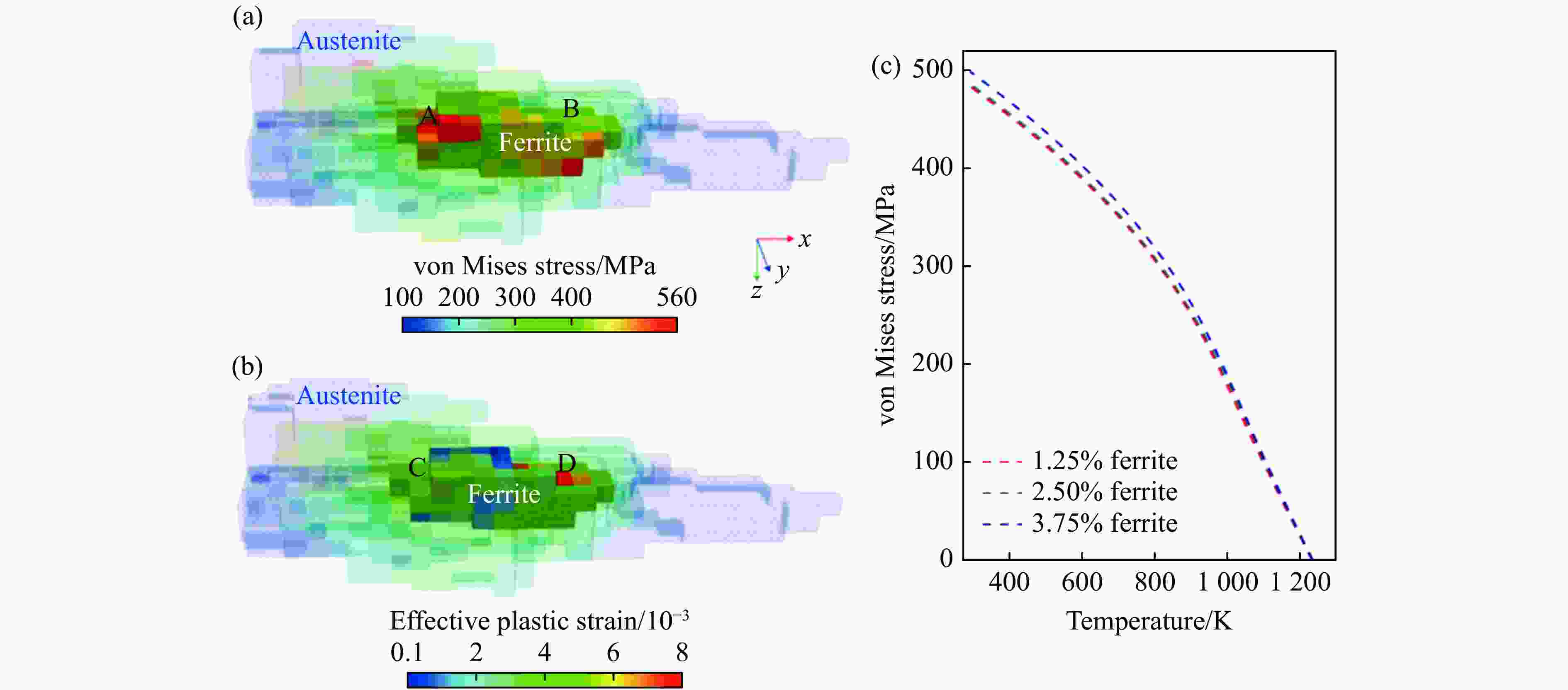 Figure  8.  Distribution of stress (a) and strain (b) in austenite and ferrite phases in additive manufactured 304L stainless steel under impact loading, and the effect of ferrite content (volume fraction) on stress (c)[63]