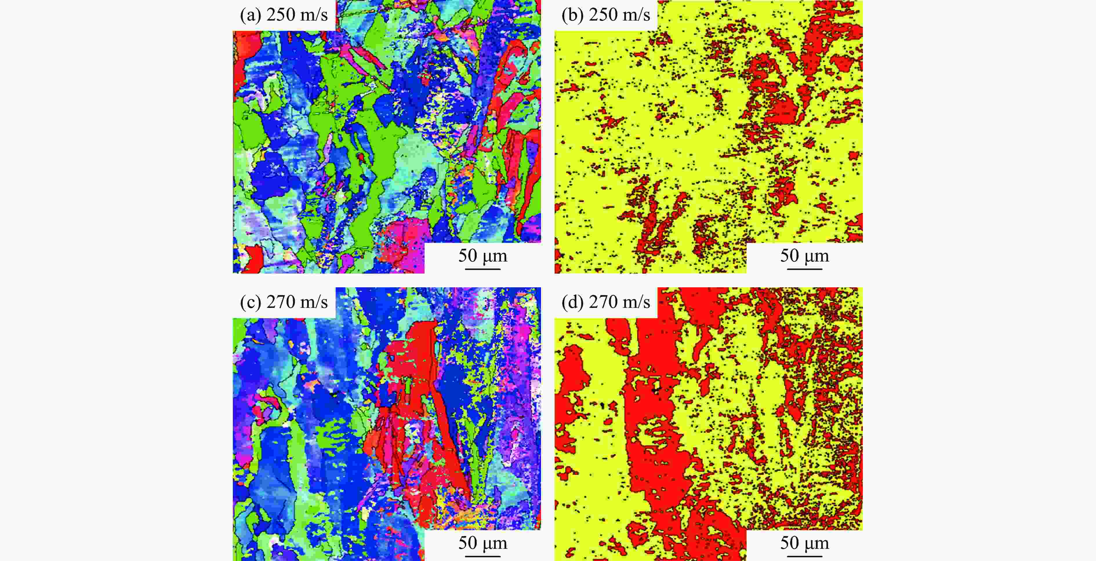 Figure  9.  Inverse pole figures and phase images of SLM GP1 stainless steel after impacting at different velocities (The red area refers to martensite phase, and yellow represents austenite phase.)[65]