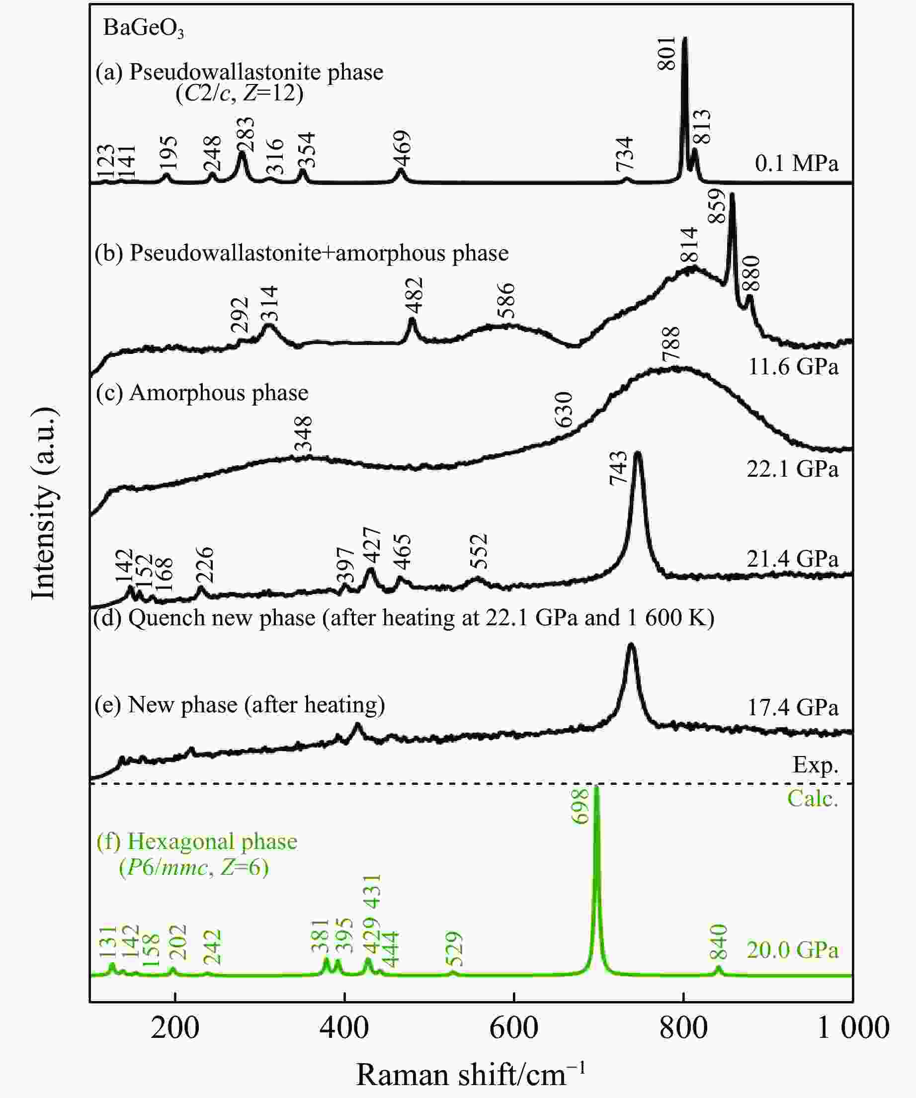 Abstract: Barium germanate (BaGeO3) was studied using double-sided laser-heating diamond anvil cell (LHDAC). At ambient conditions, BaGeO3 has a pseudowollastonite structure. At about 12 GPa, BaGeO3 crystal begin to translate into an amorphous phase. The amorphous BaGeO3 was further pressurized to about 22 GPa and then heated at (1800 ± 200) K conditions. Raman spectra shows the amorphous BaGeO3 transforms into a new high pressure phase, which has not been reported so far. The new high pressure phase of BaGeO3 was further measured with the synchrotron radiation X-ray diffraction in the pressure ranges of 0−17.4 GPa. The diffraction patterns can be indexed with a 6H-type hexagonal perovskite structure and this structure remained stable as the pressure unloading to ambient pressure. In order to obtain the structural parameters of the new high pressure phase of BaGeO3, the X-ray diffraction patterns of 17.4 GPa and ambient pressure were refined with a model structure of 6H-type perovskite using the Rietveld method. The experimental pressure-volume data was fitted with the second-order Birch-Murnaghan equation of state, and obtained the volume bulk modulus and zero-pressure unit-cell volume are K0 = 150(2) GPa and V0 = 373.0(3) A3 respectively. On the basis of the experimental results in this study, we also carried out the first-principle theoretical calculation on the 6H-type perovskite BaGeO3. The calculated lattice constants and volume with the corresponding pressures are good agreement with the experimental results. Furthermore, the calculated volume bulk modulus and zero-pressure unit-cell volume are K0 = 153(1) GPa, V0 = 374.2(1) A3 respectively. The calculated Raman spectra at 20.0 GPa is also well consistent with the experimental results. This study not only complements the structural phase transition of pseudowallastonite BaGeO3 at high temperature and high pressure, but also builds a solid foundation for further characterizing the physical and chemical properties of pseudowallastonite BaGeO3, and gives a chance to develop the perovskite structured germanate functional materials. In addition, this study has an important indicative significance for us to understand the phase transition rule and stability of silicate perovskite, the physical and chemical properties and changes of Earth's lower mantle. -