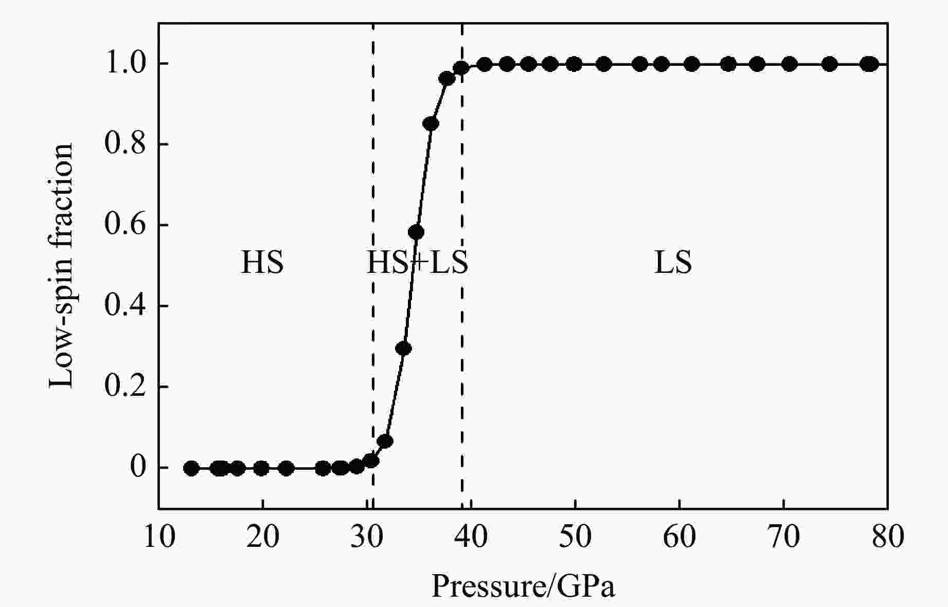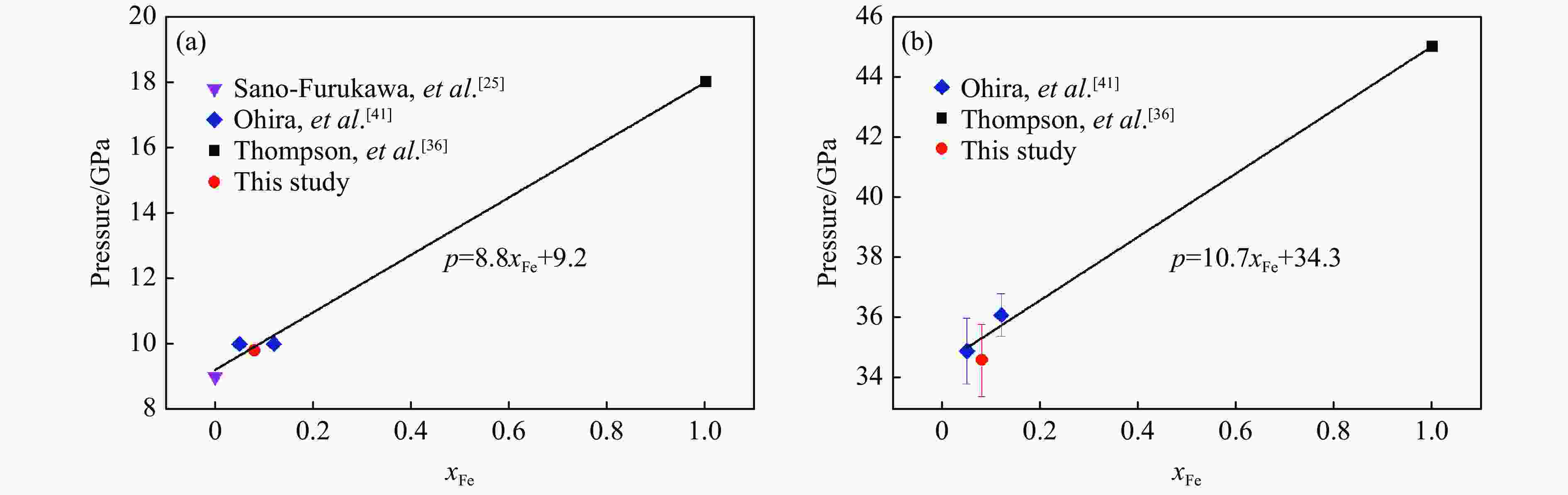 $\delta $ -(Al,Fe)OOH中有序不对称氢键P21nm结构到无序对称氢键Pnnm结构的相转变压力与铁含量的关系(a)和三价铁自旋态转变压力与铁含量的关系(b)Figure 10. Transition pressures of (a) ordered P21nm phase with asymmetric hydrogen bonds to disordered Pnnm phase with symmetric hydrogen bonds and (b) high-low spin of Fe (Ⅲ) as a function of FeOOH content in