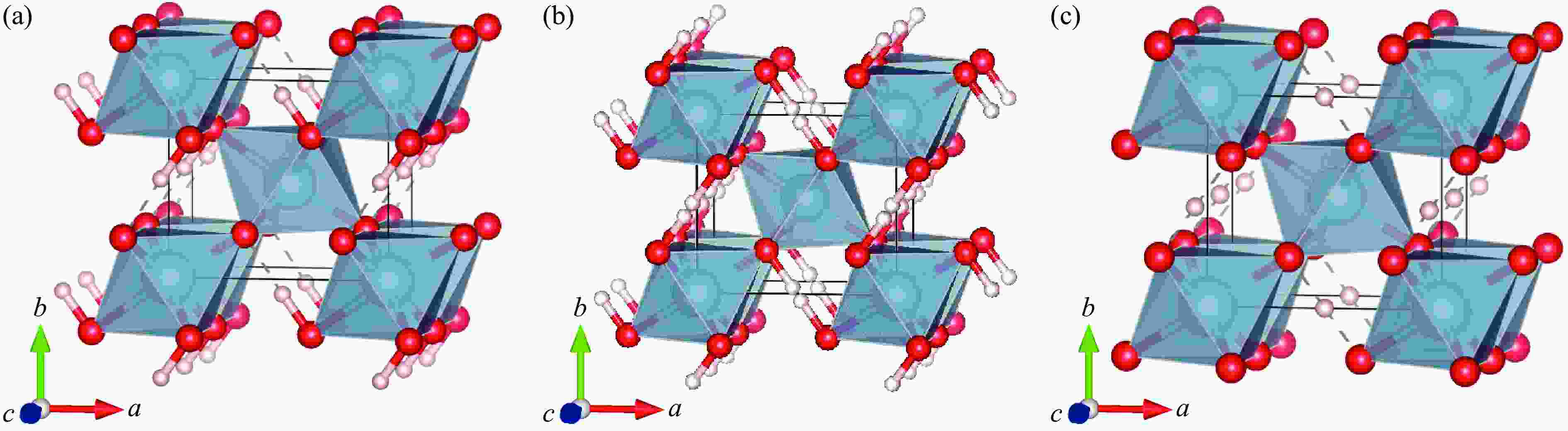 $\delta $ phase: (a) P21nm phase with asymmetric hydrogen bonds, (b) disordered Pnnm phase, (c) Pnnm phase with symmetric hydrogen bonds (Large silver, medium red and small white spheres represent Al, O and H atoms, respectively.)图 4