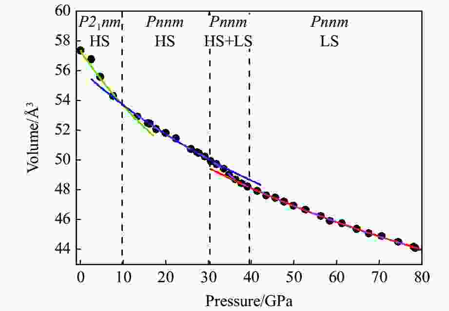 $\delta $ -Fe8 as function of pressure (Black circles are experimental data. Solid lines are fitting results using Birch-Murnaghan equation of state (B-M EOS) from ambient pressure to 10 GPa (green line, high spin P21nm phase), and from 10 GPa to 28 GPa (blue line, high-spin disordered and symmetric hydrogen-bond Pnnm phase), and from 45 GPa to 78 GPa (red line, low spin and symmetric hydrogen-bond Pnnm phase). The dash purple line represents modeled results using B-M EOS and Wentzcovitch’s theory from 10 GPa to 78 GPa. The vertical dash black lines mark phase boundaries (9.7, 31.5 and 39.5 GPa).)图 9