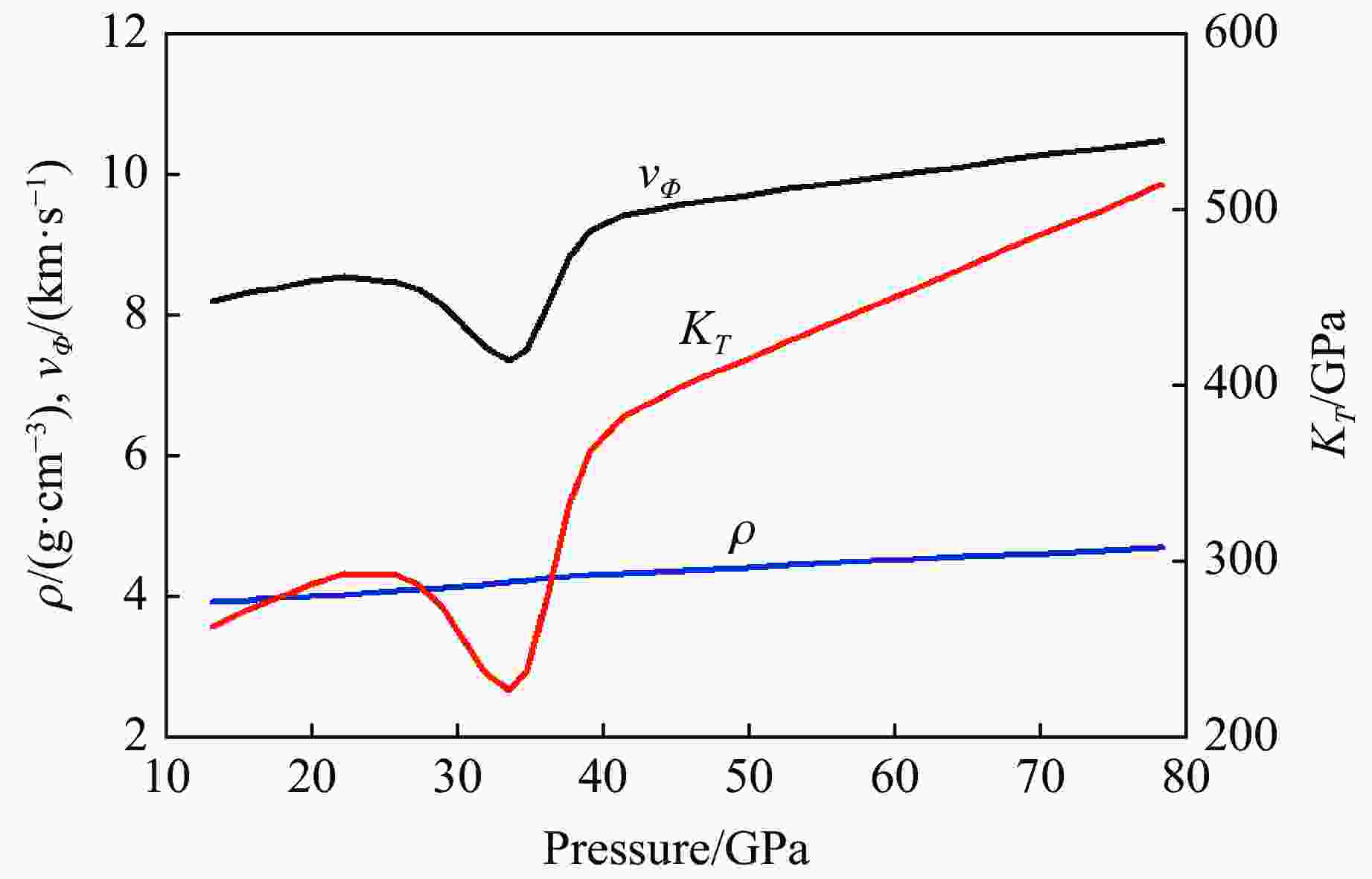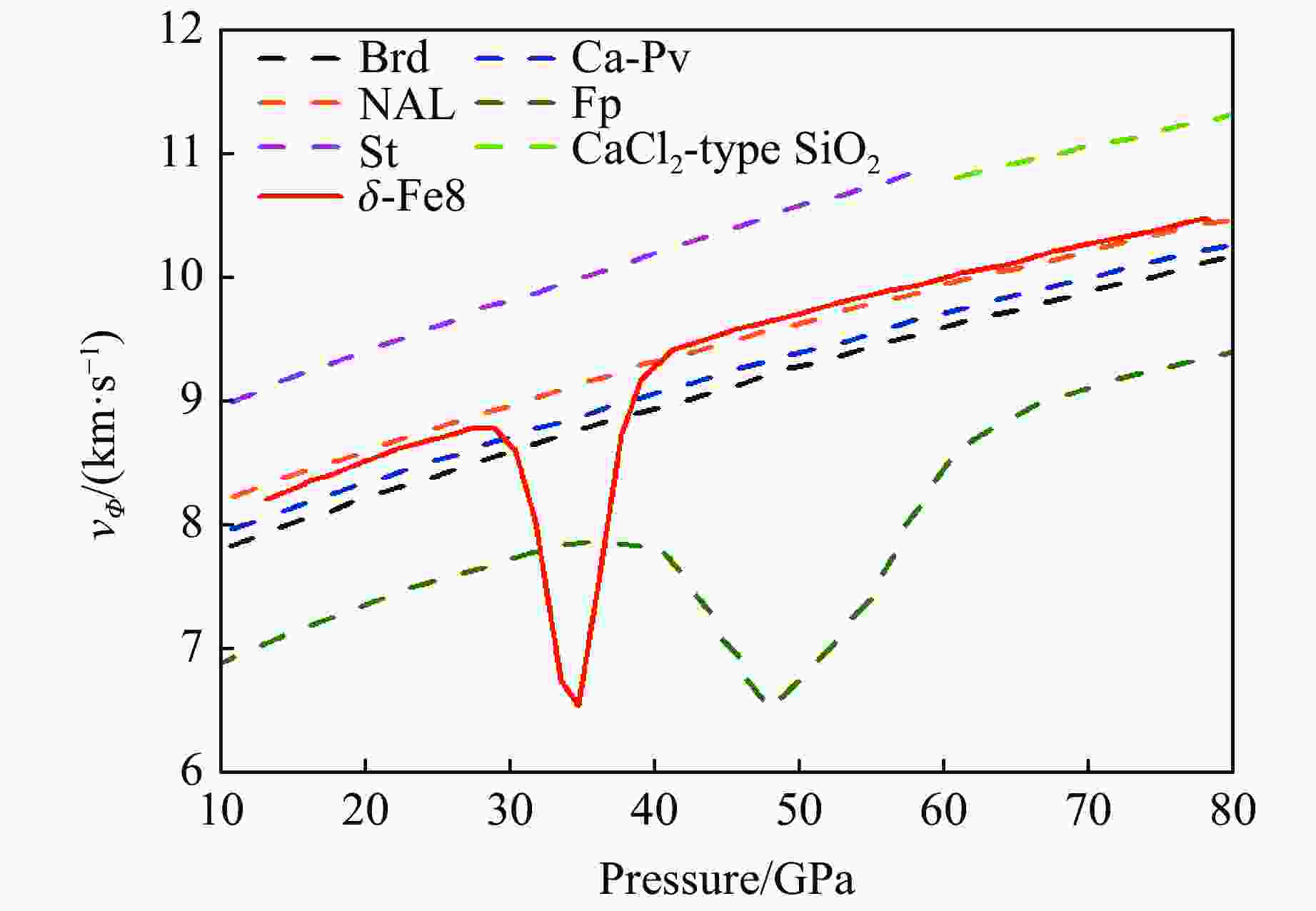 $\delta $ -Fe8和典型下地幔矿物在高压下的体波速$v_\varPhi $ (Brd:布里奇曼石;Ca-Pv:CaSiO3钙钛矿;NAL:新六方富铝相;Fp:Mg0.83Fe0.17O铁方镁石;St:斯石英)Figure 9. Bulk sound velocity (