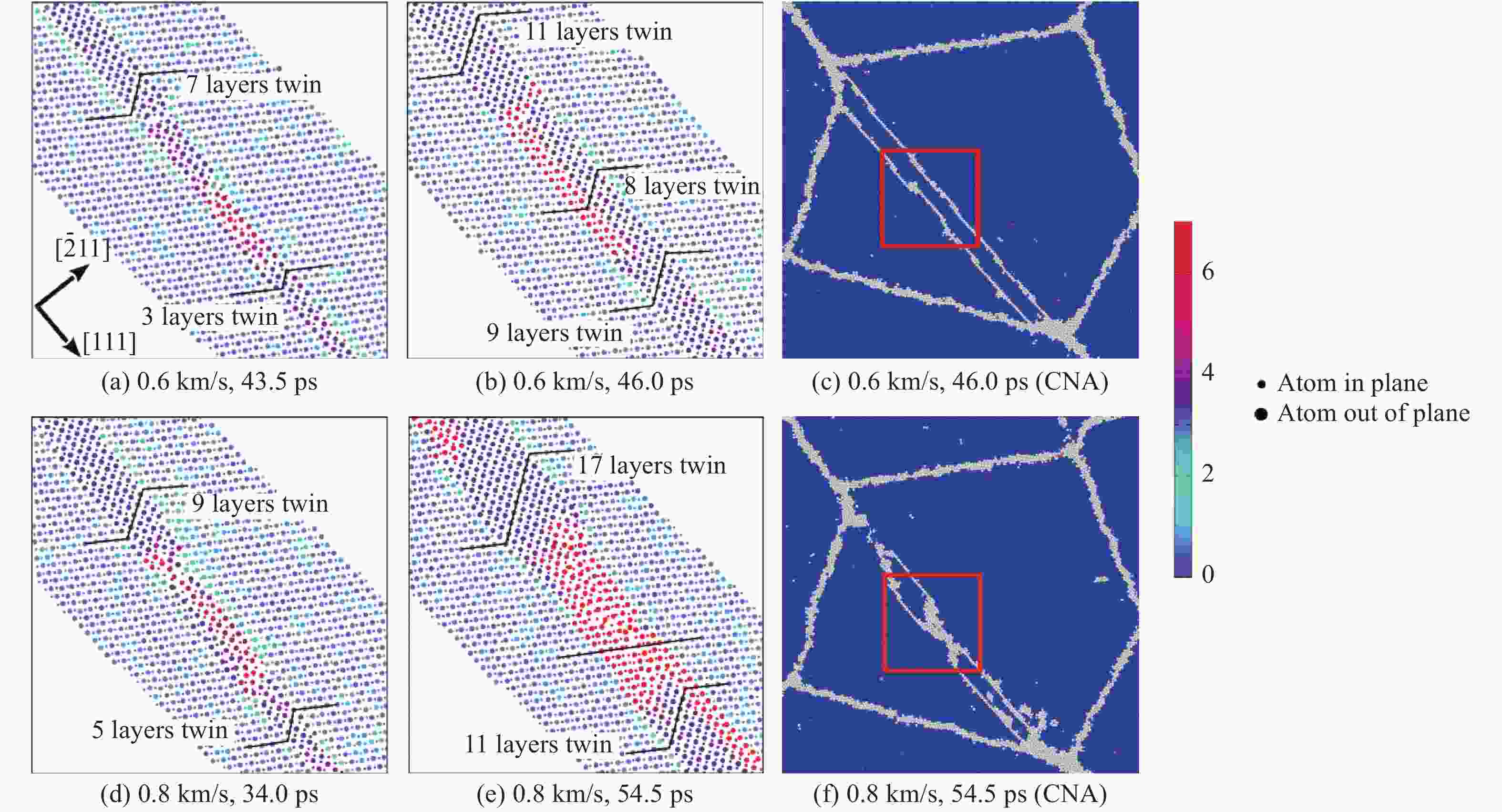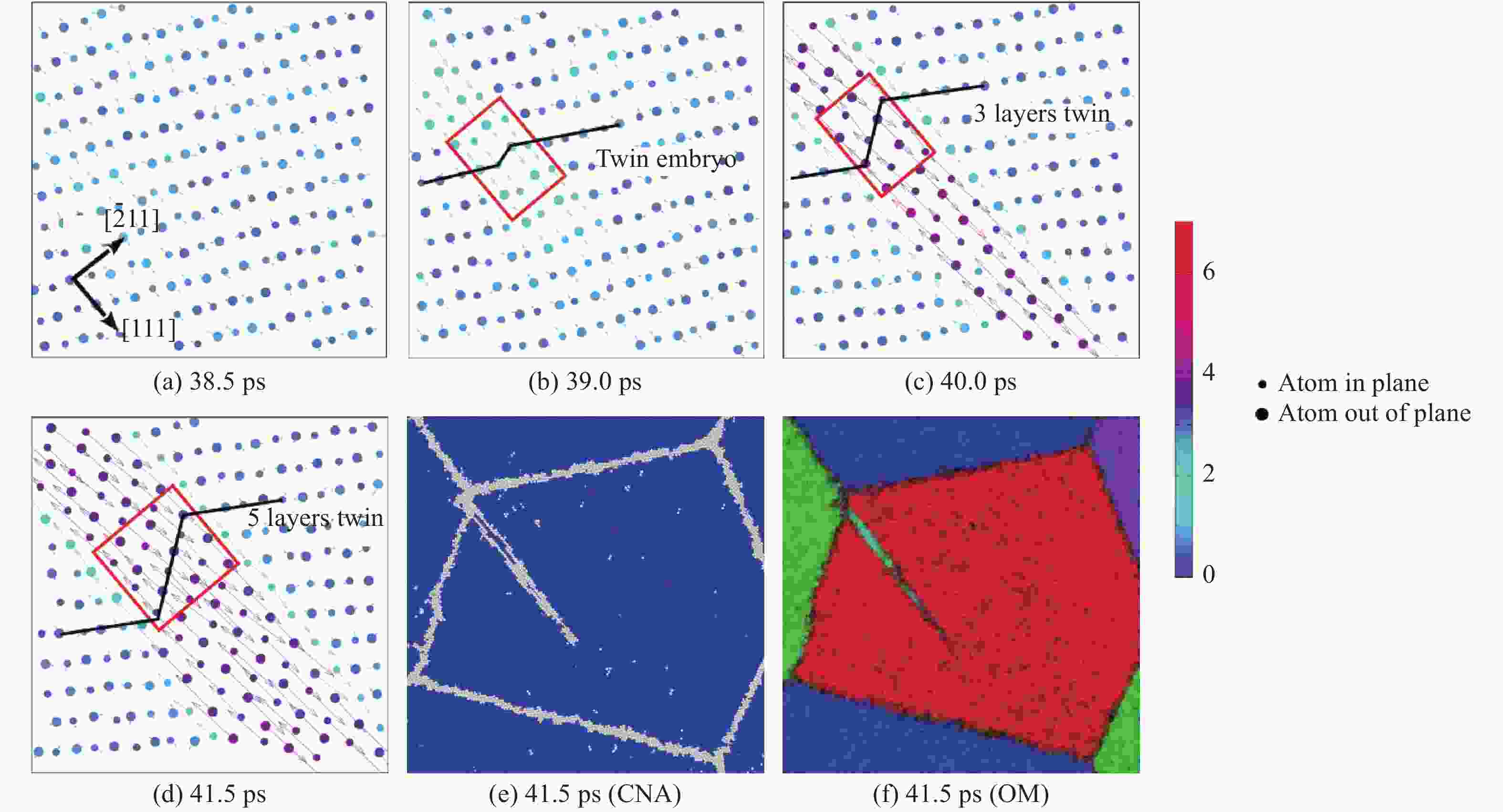 图  nc-NiTi {112}奥氏体孪晶T1在冲击速度up = 0.6 km/s下的成核和扩展[20]
