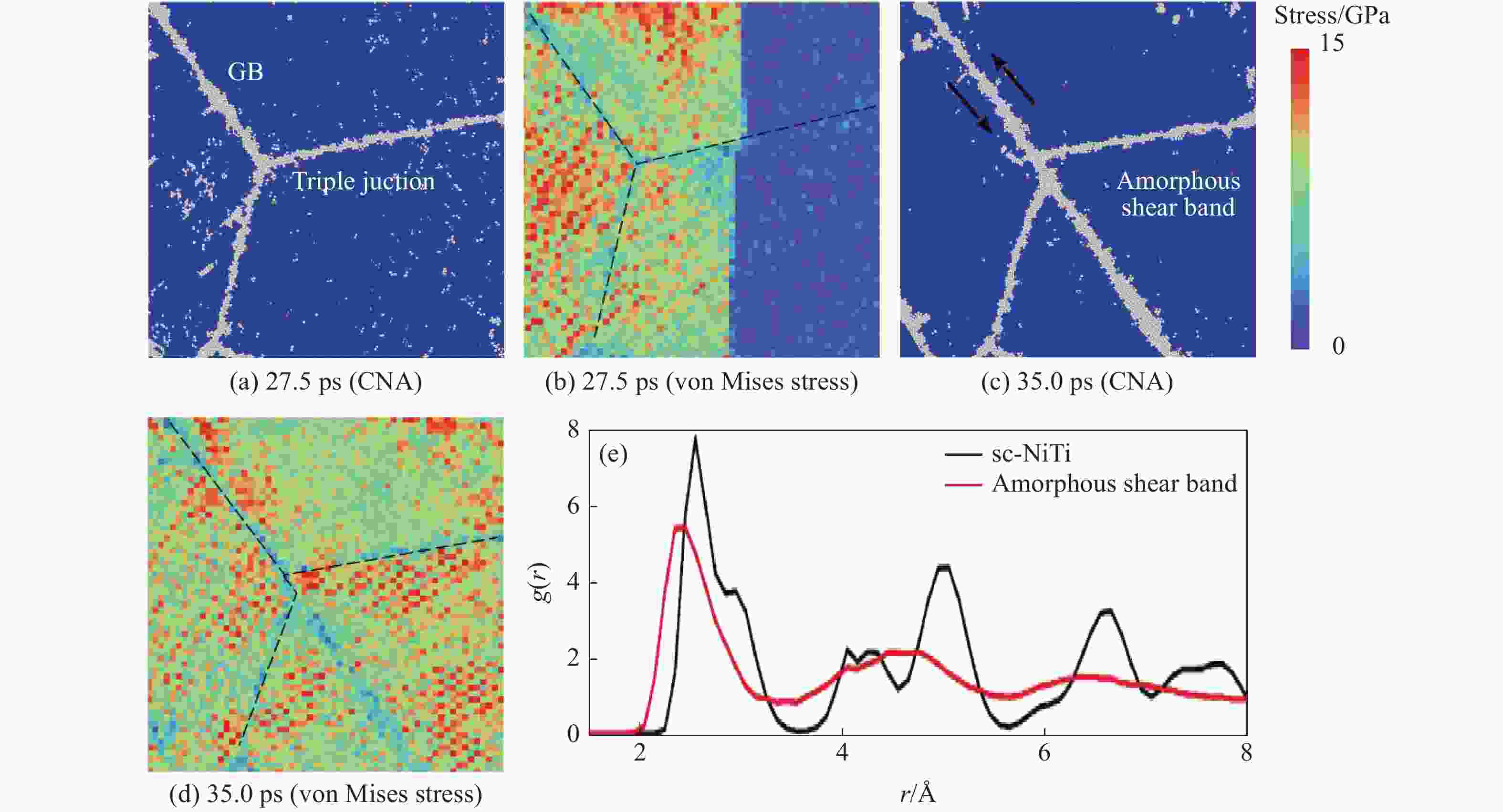 Figure  11.  Formation of amorphous shear band at grain boundaries (GBs) triple junction for shock loading velocity up = 1.0 km/s, and the radical distribution function g(r) of the B2 structure sc-NiTi and amorphous shear band in nc-NiTi[20]