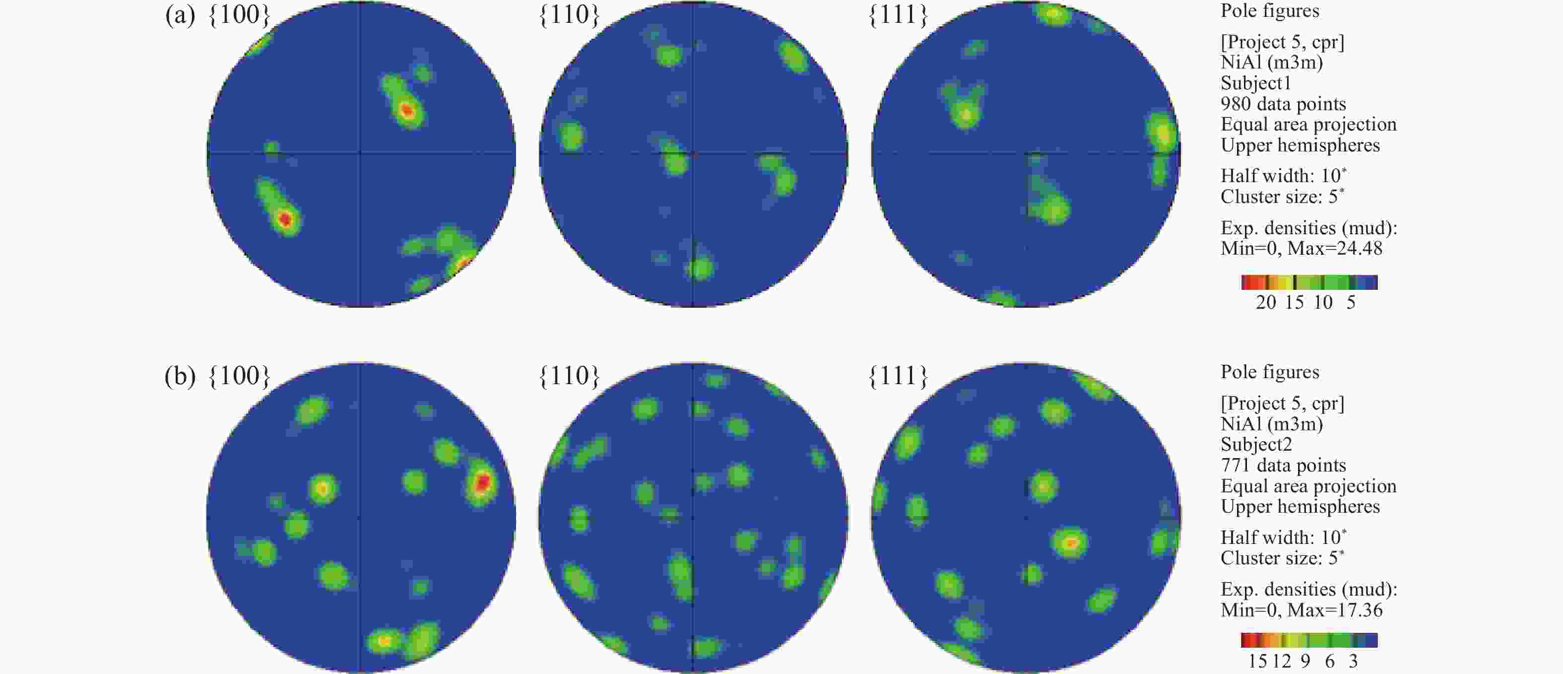 图  14  NiTi合金冲击拉伸实验回收样品的极射赤面(赤道面)投影图:(a) Shot 741,$\sigma $H = 6.4 GPa;(b) Shot 738,$\sigma $H = 12.4 GPa
