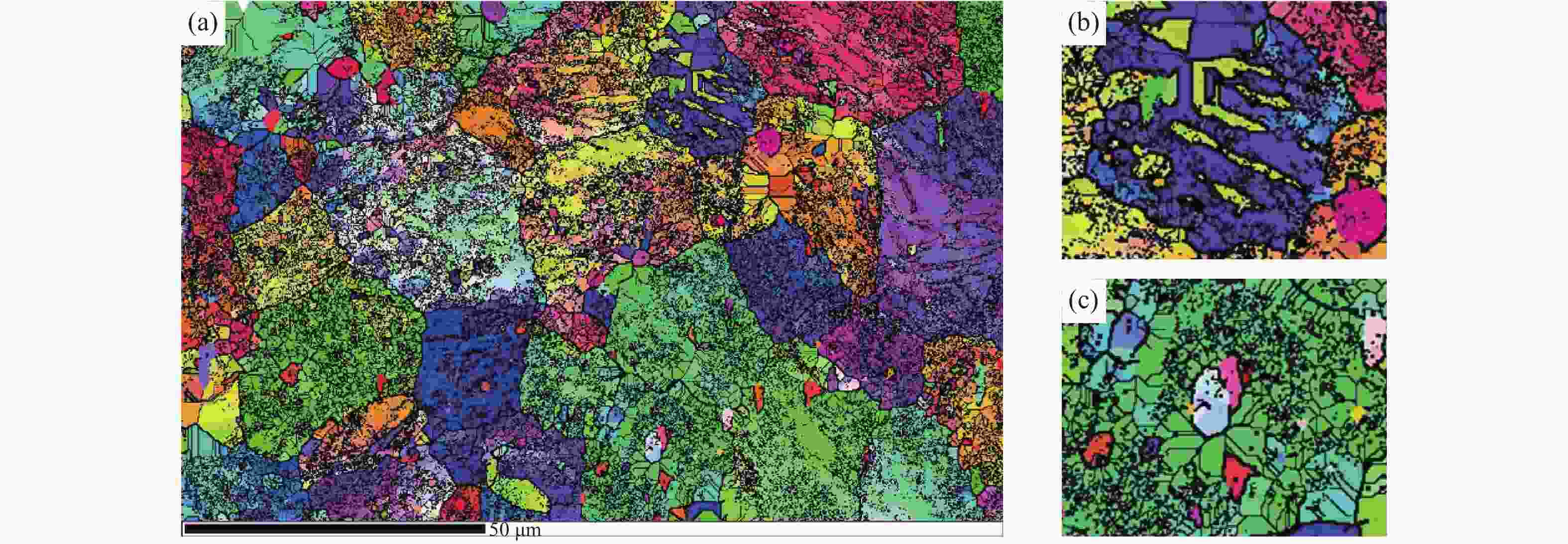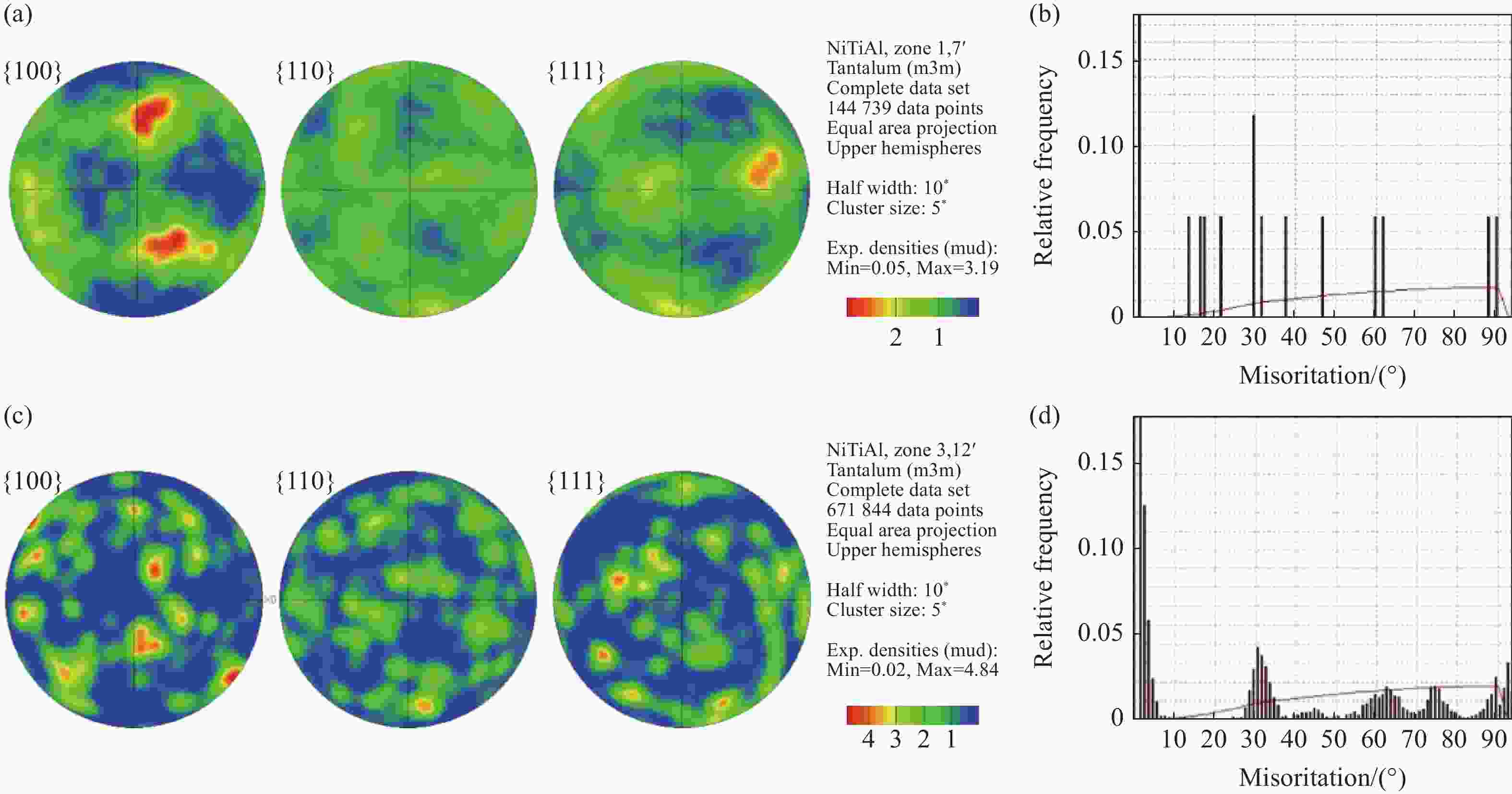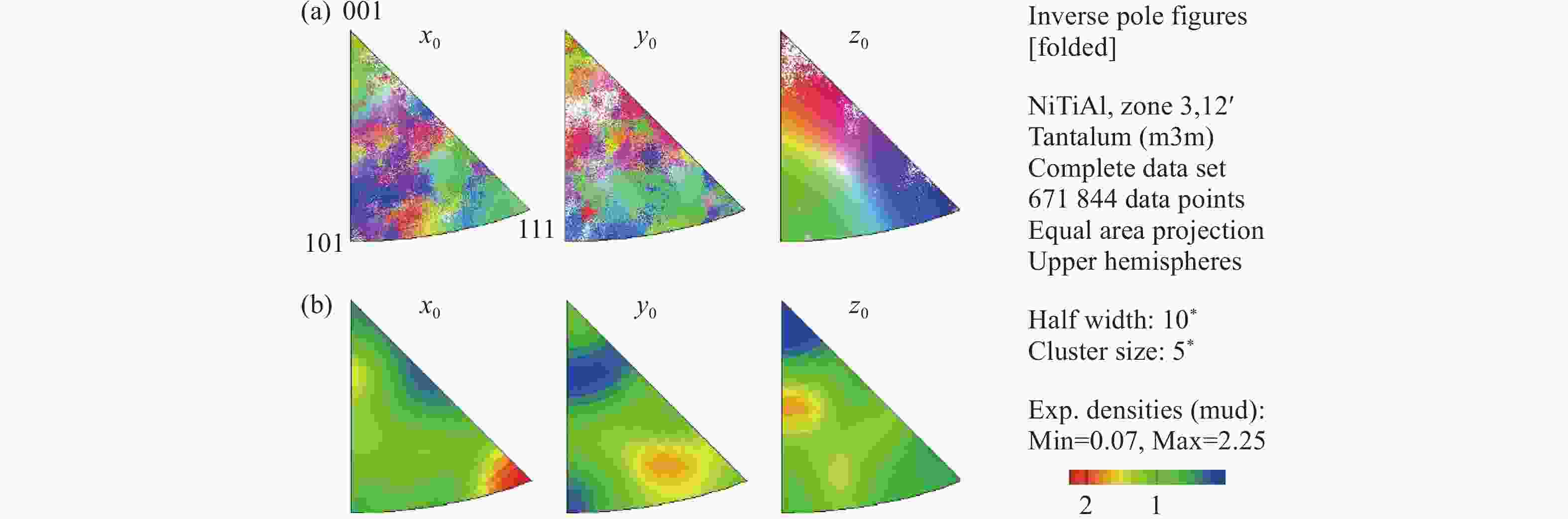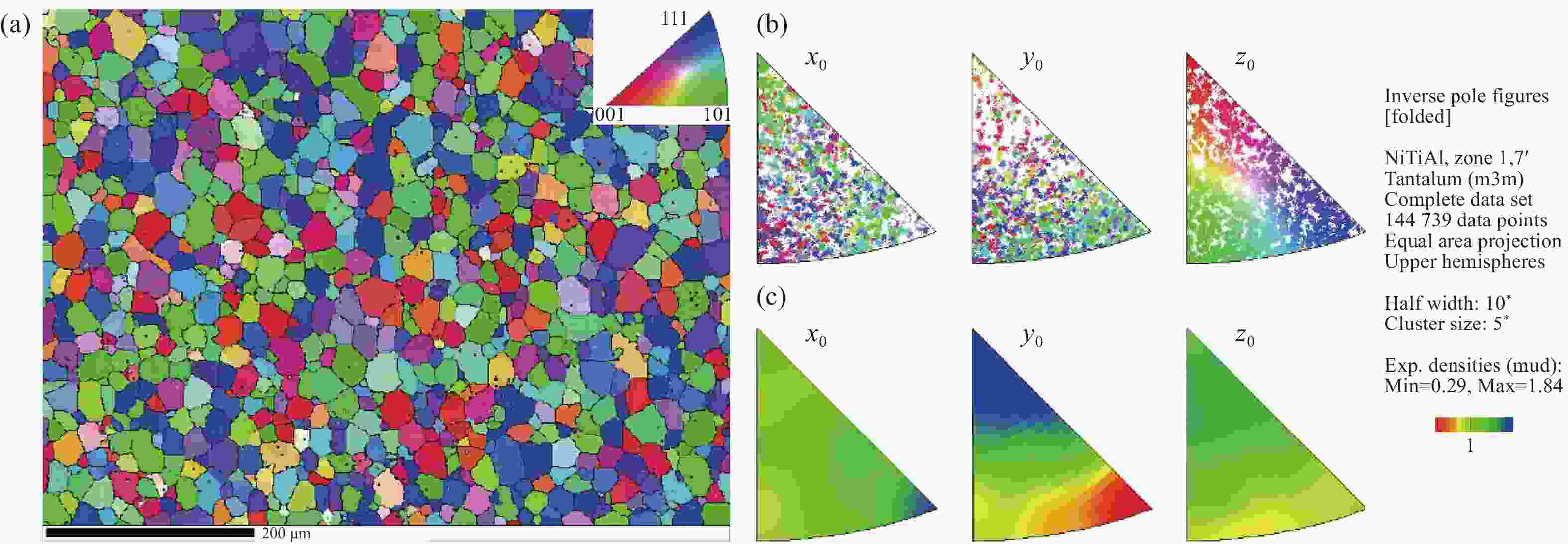 • 图  EBSD测得的Ni52Ti48合金显微组织的反极图(a)[9]、取向分布散点图(b)及取向分布密度图(c)