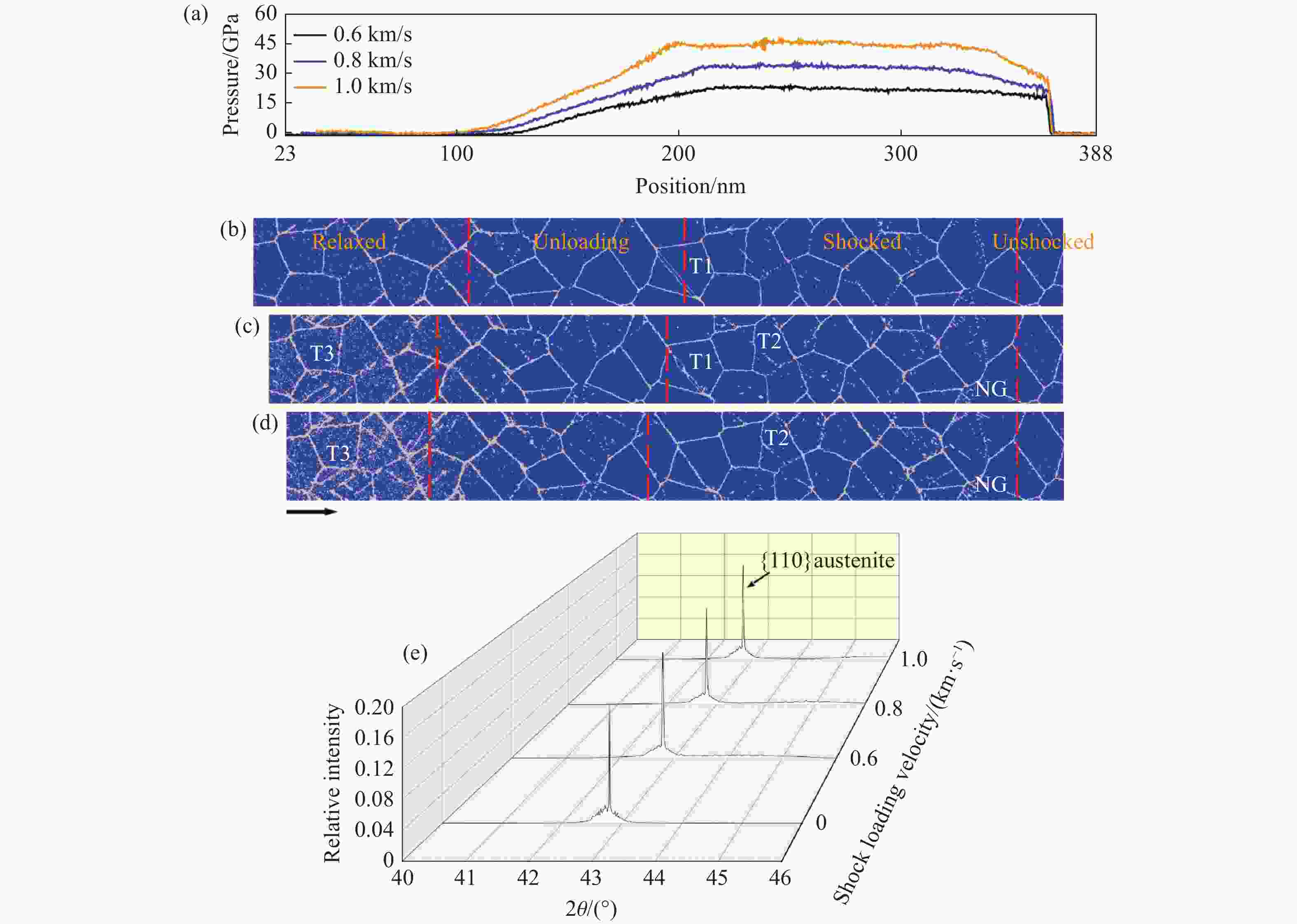图  不同冲击粒子速度下的一维应力波剖面演化(a);不同冲击粒子速度下的演化结果比较:(b) 0.6 km/s,(c) 0.8 km/s,(d) 1.0 km/s(不同的状态以红色长划线区分,微结构包括孪晶T1、T2、T3和新晶粒(NG),用CNA方法进行表征,冲击方向用黑色箭头标示);初始奥氏体以及图8(b)图8(c)图8(d)所示nc-NiTi模型的模拟XRD分析结果(e)[20]