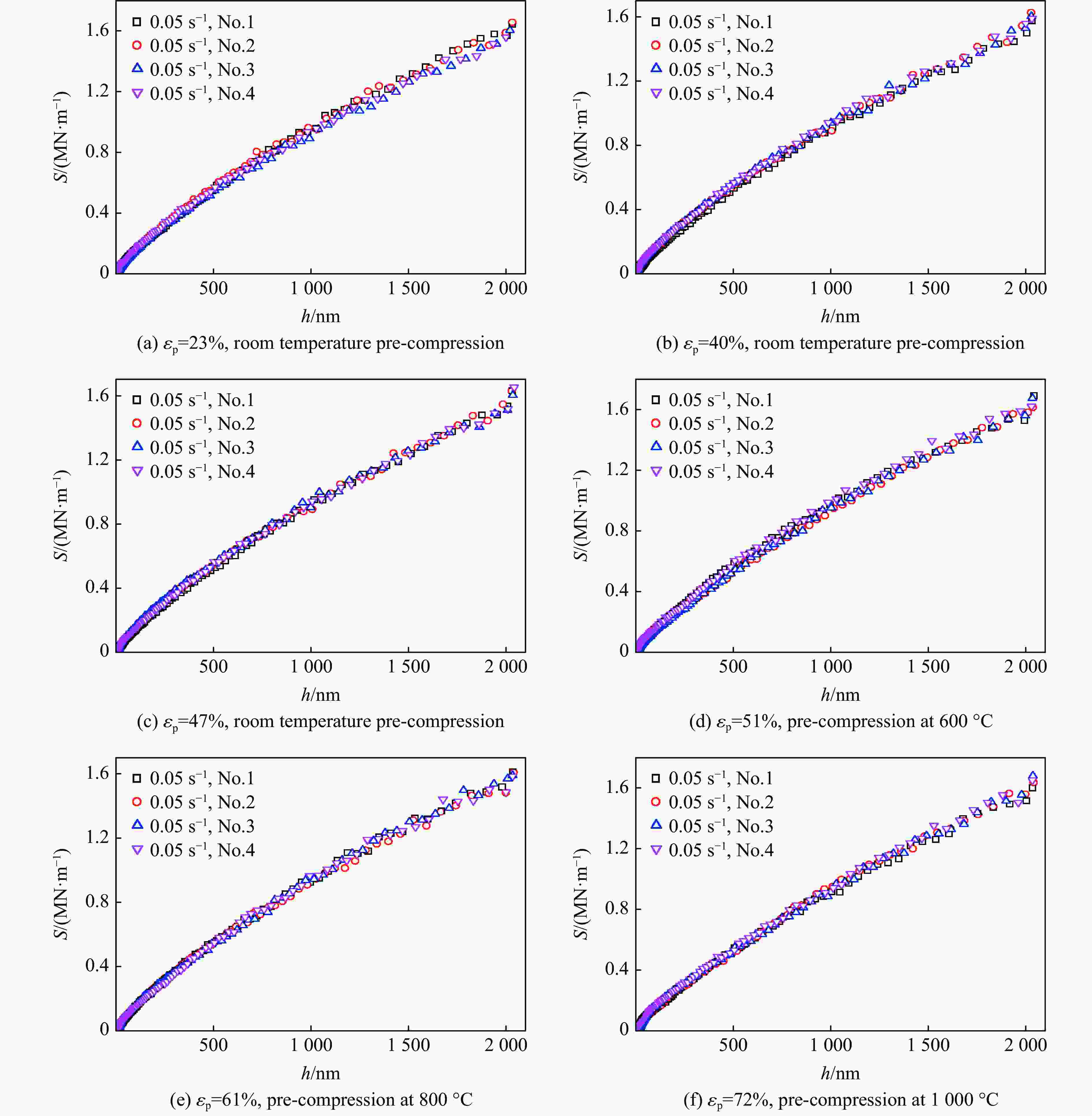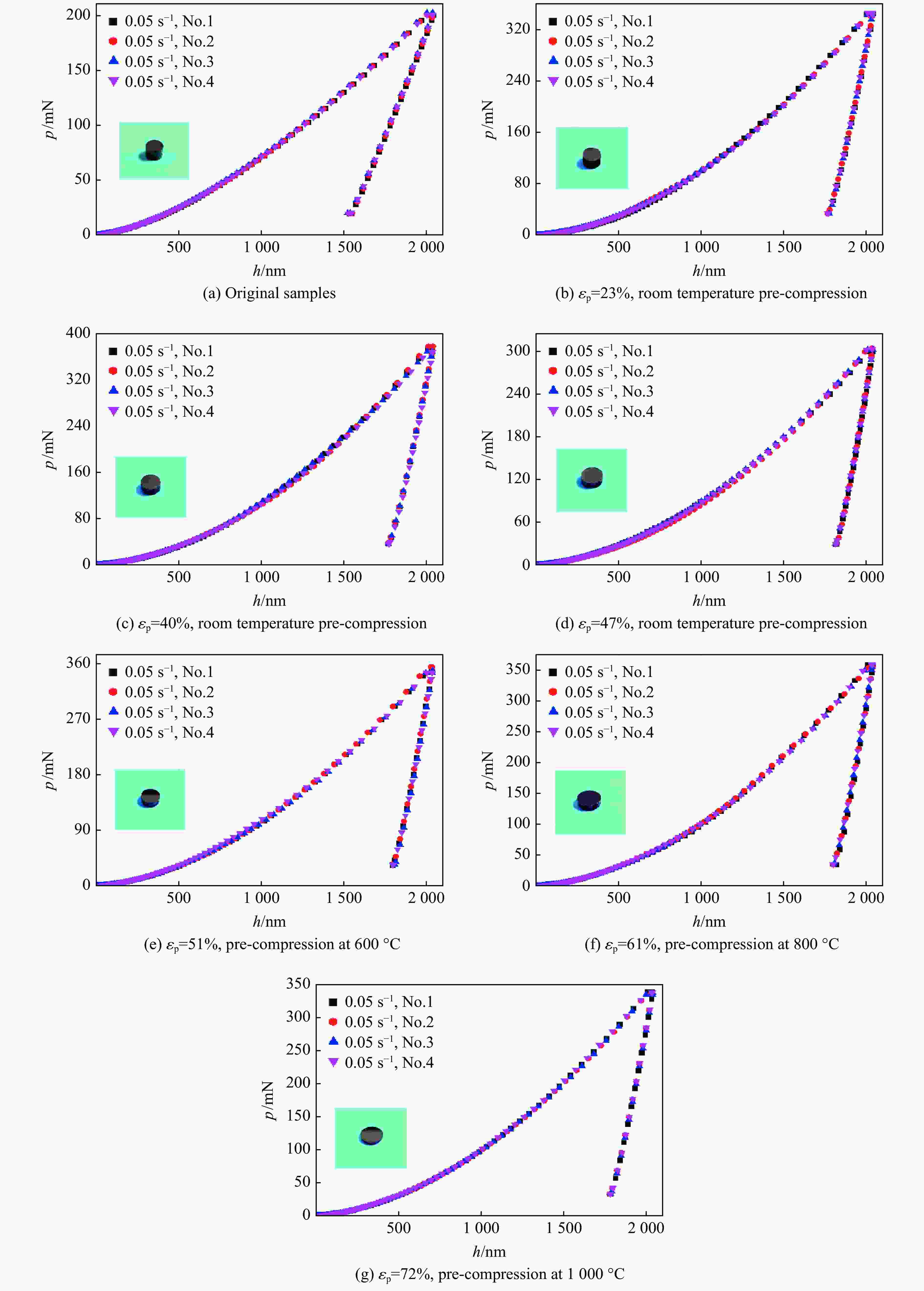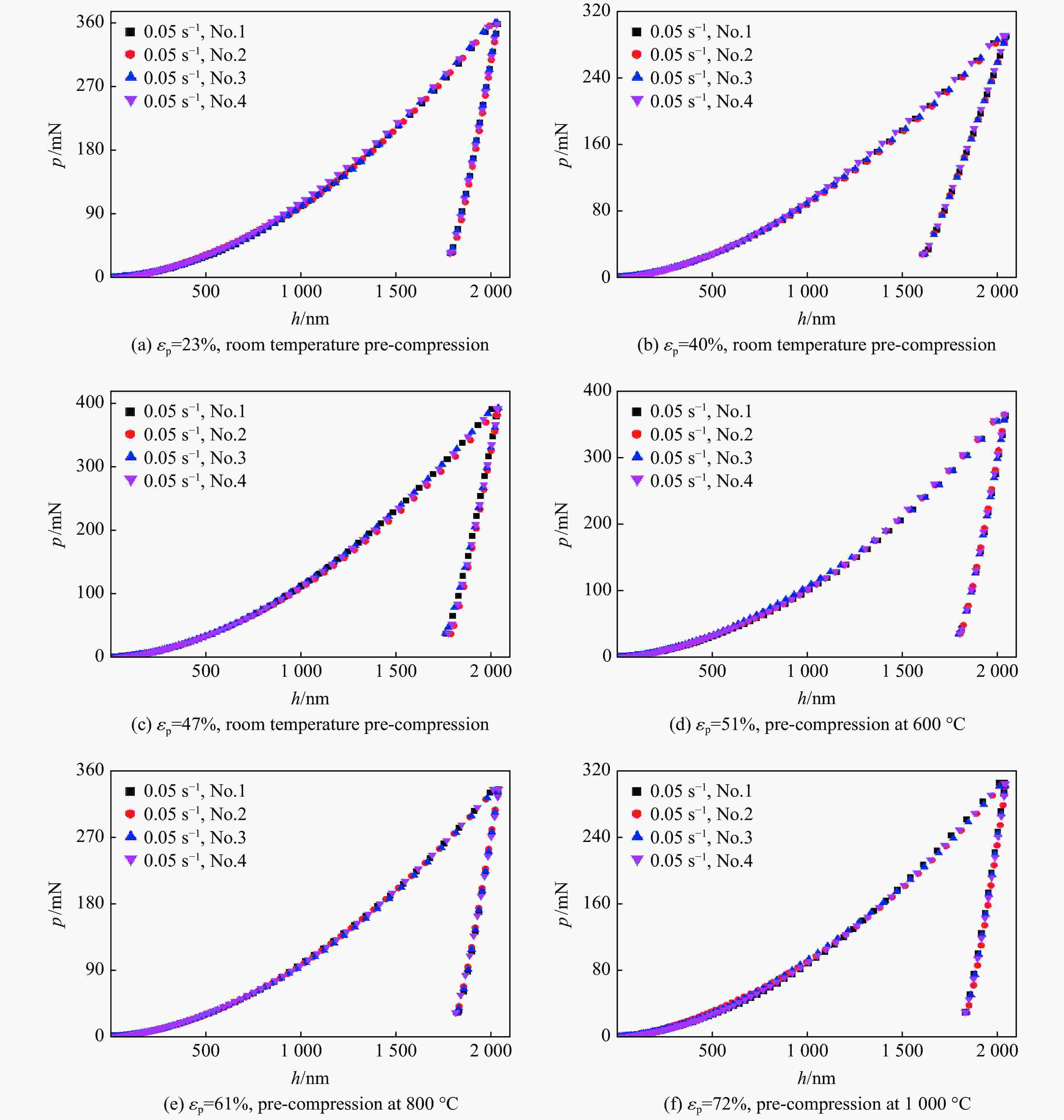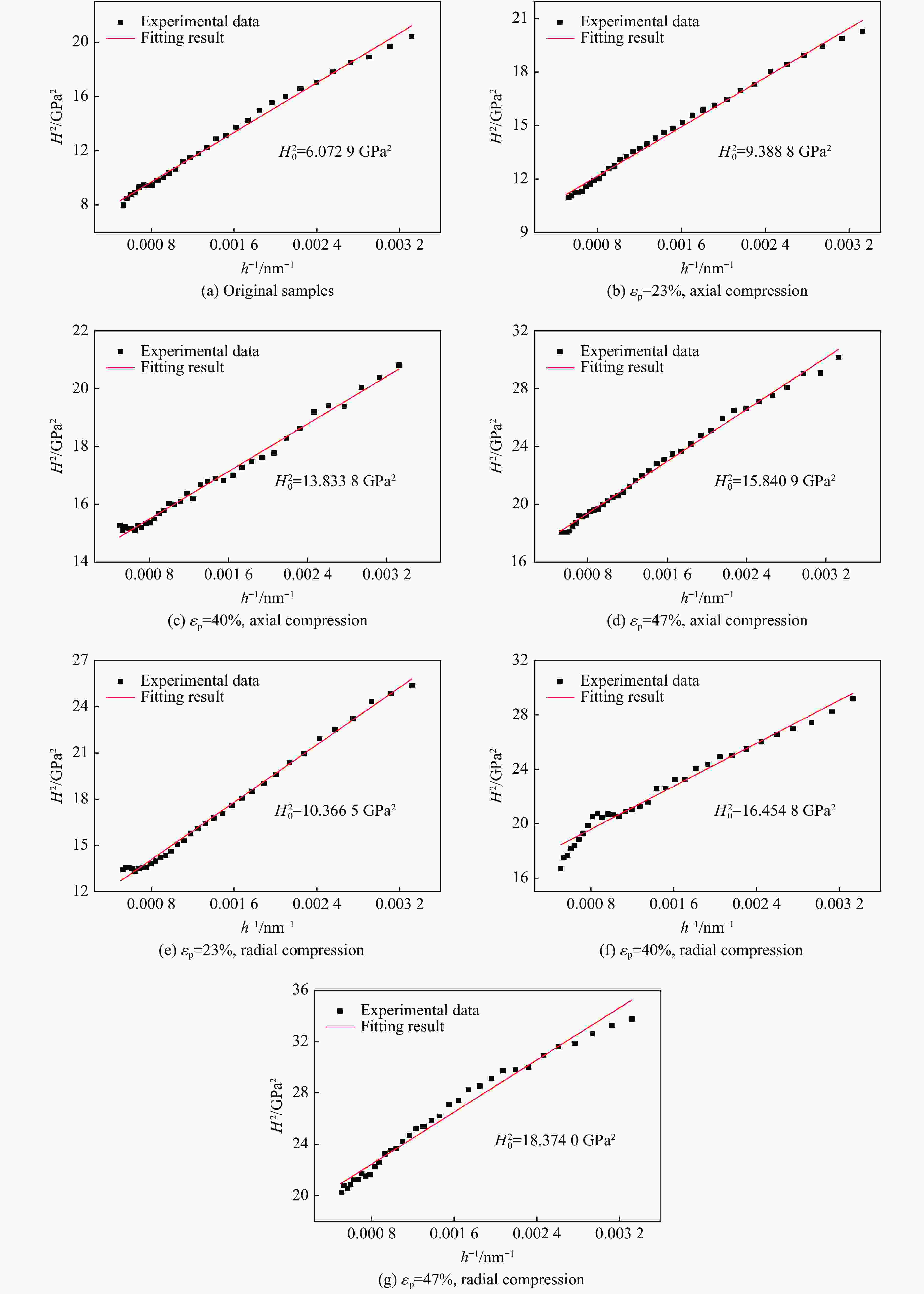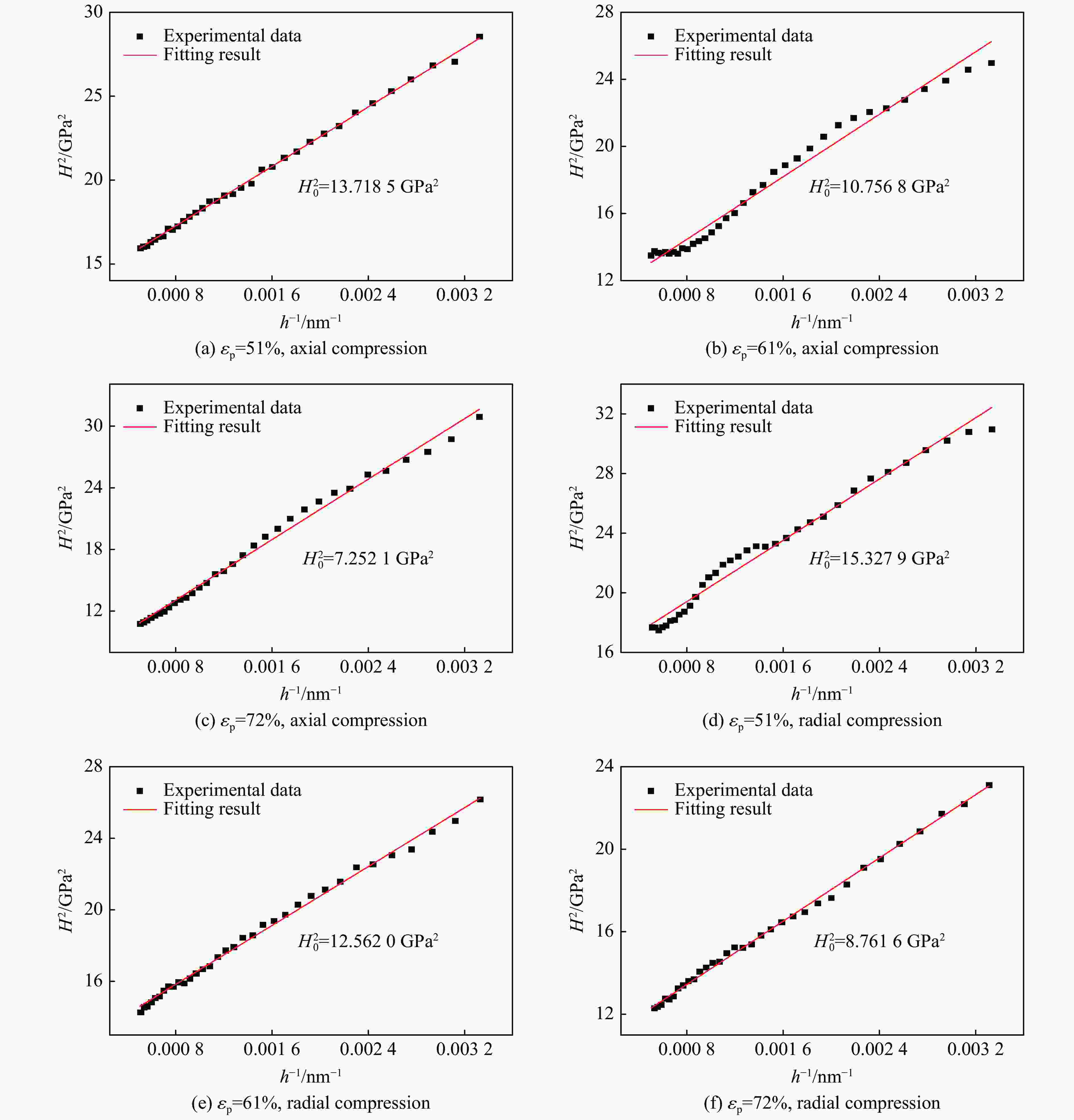 Plastic strain/% H0/GPa Axial compression Radial compression 23 3.06 3.22 40 3.72 4.05 47 3.98 4.28 表 2 高温动态预压缩下不同塑性变形对应的剔除尺度效应的硬度