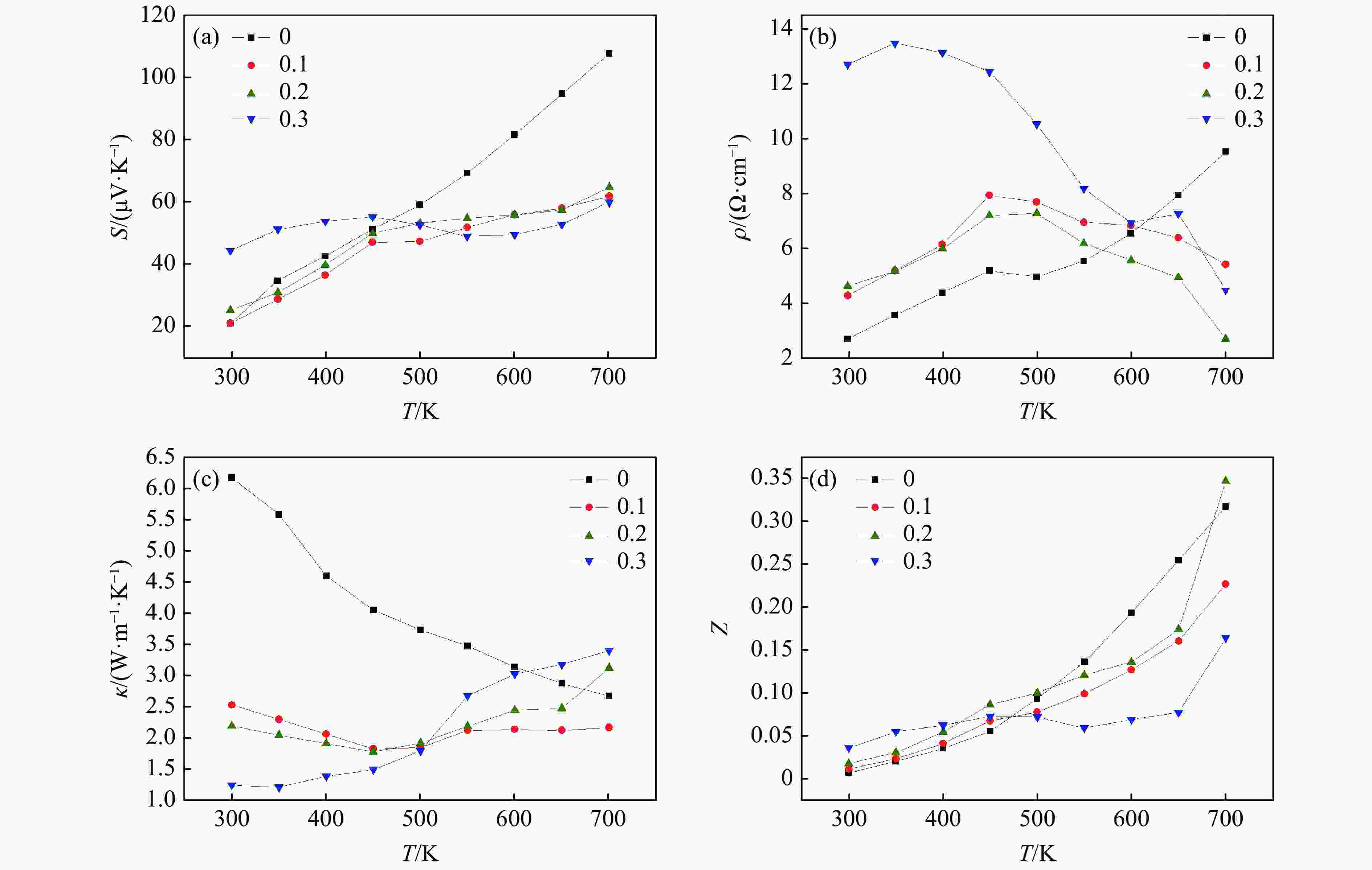 Figure  4.  Electrical properties of GexSn1−xTe: (a) Seebeck coefficient, (b) resistivity, (c) thermal conductivity, (d) quality factor