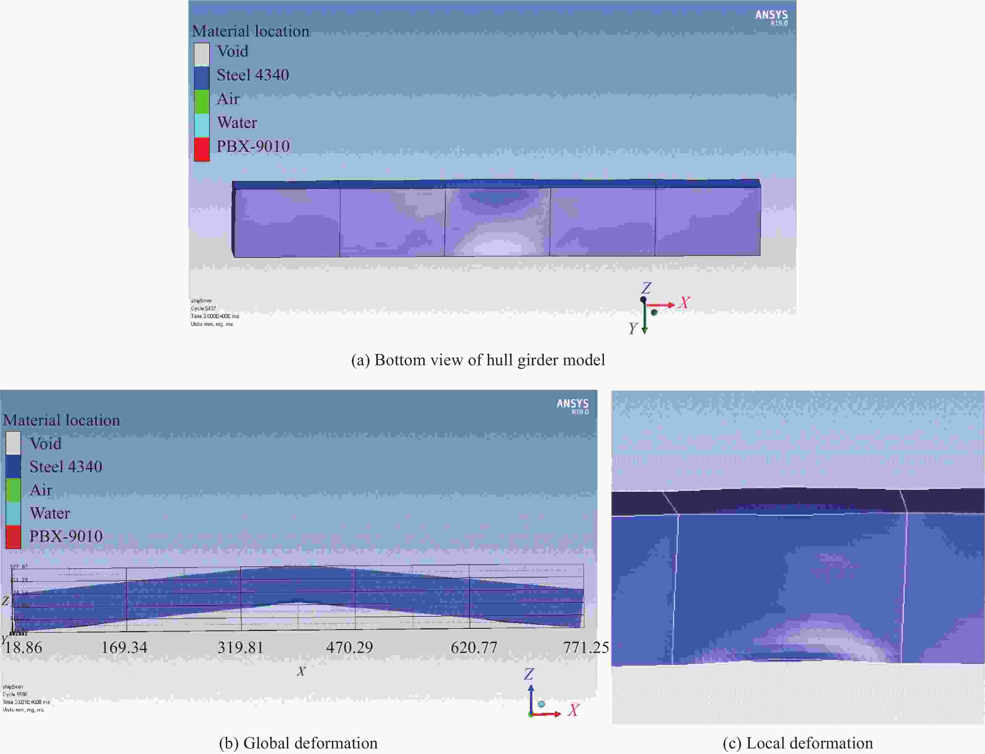 摘要: 针对在多次水下爆炸中船体梁的累积毁伤问题,采用 AUTODYN软件与试验相结合的方法,分析了炸药当量、爆距、爆炸次数等因素对船体梁累积毁伤效应的影响。结果表明:在水下爆炸加载作用下,船体梁会发生中部凹陷局部塑性变形和整体中拱塑性弯曲变形。在一定冲击因子作用下,其挠度与水下爆炸加载次数呈线性关系,且药量越大,挠度越大。爆距相同时,同等当量炸药对船体梁进行单次和均分连续3次水下爆炸加载,其最终塑性变形挠度不同,均分连续3次爆炸作用下船体梁的塑性变形挠度更小。Abstract: To explore the accumulative damage problem of the hull girder subjected to multiple underwater explosions, the influences of explosive equivalent, stand-off distance, and the number of explosions to the hull girder were studied by ultilizing of AUTODYN software together with testing methods. The results show that under underwater explosive loadings, there are two deformation modes, i.e., local plastic deformation of middle depression and plastic bending deformation of global hogging. At a certain shock factor, the deflection values change linearly with the loading times of multiple underwater explosions, and they increase with the increase of explosive charge. The final deflection values of hull girders are different between the cases subjected to single and those to uniform three consecutive underwater explosions under the same stand-off distances and equivalent charges. The deflection values of hull girders decrease subjected to three-time uniform explosions, and are only half of the deflection values under single-time explosion loadings.