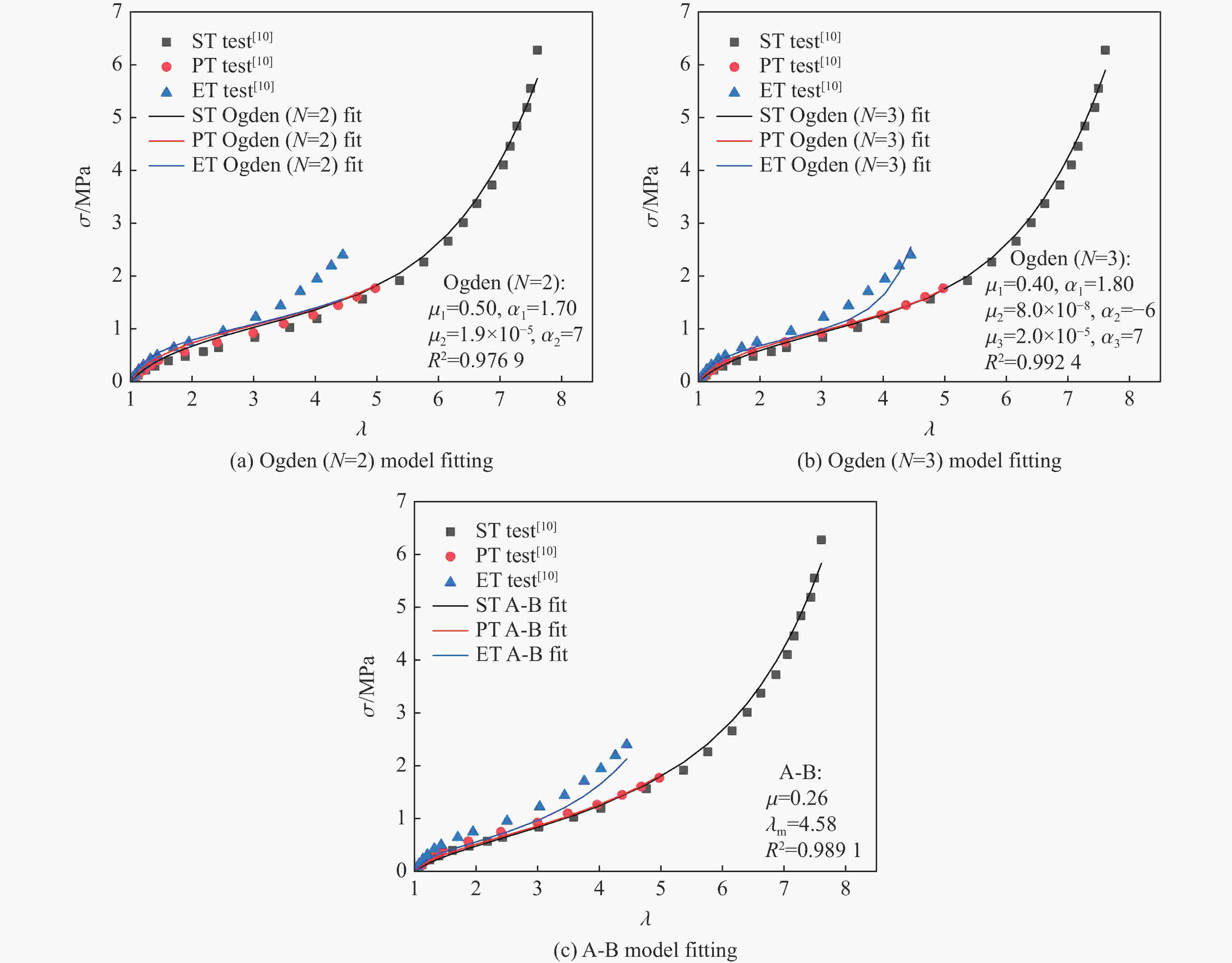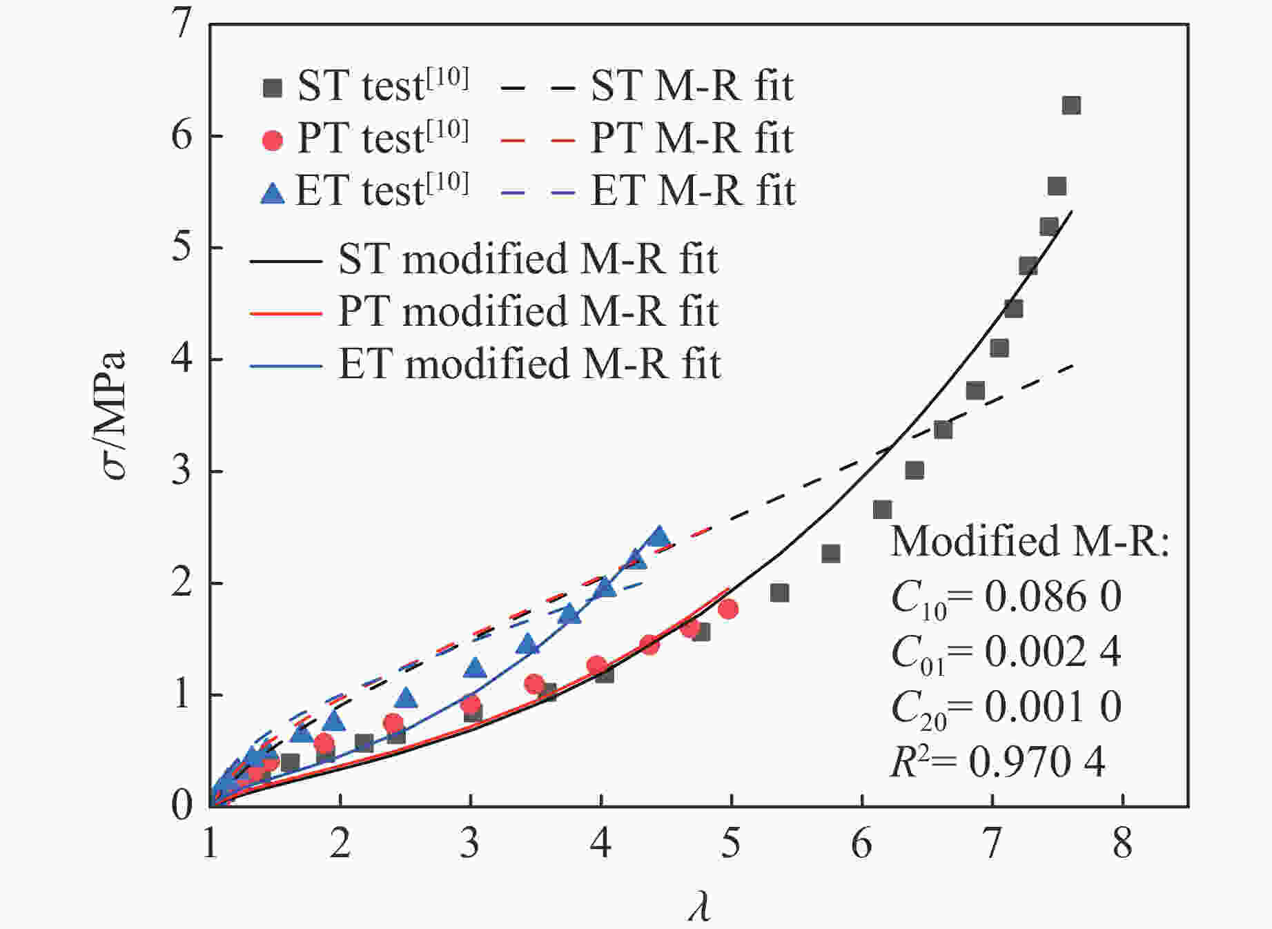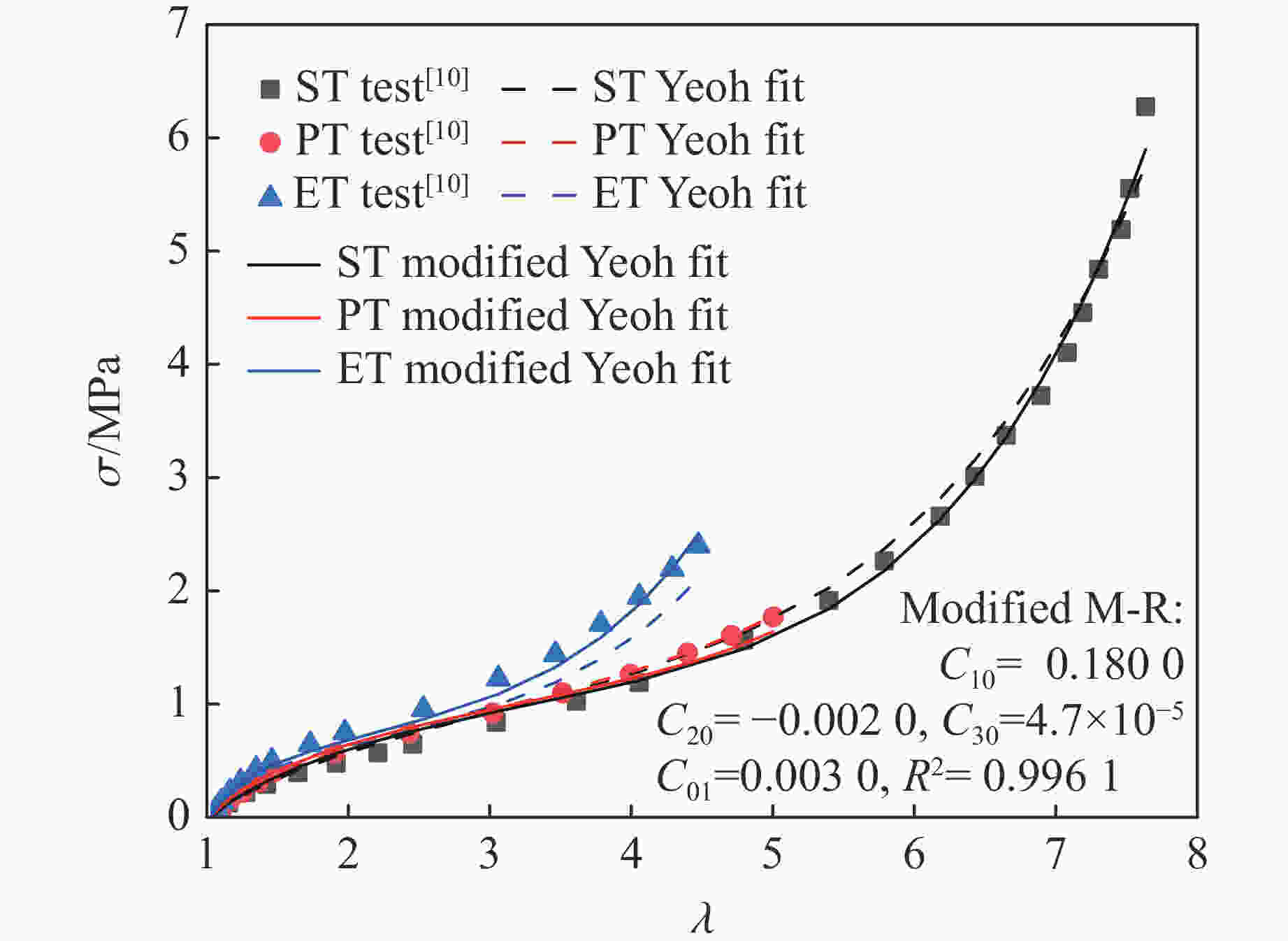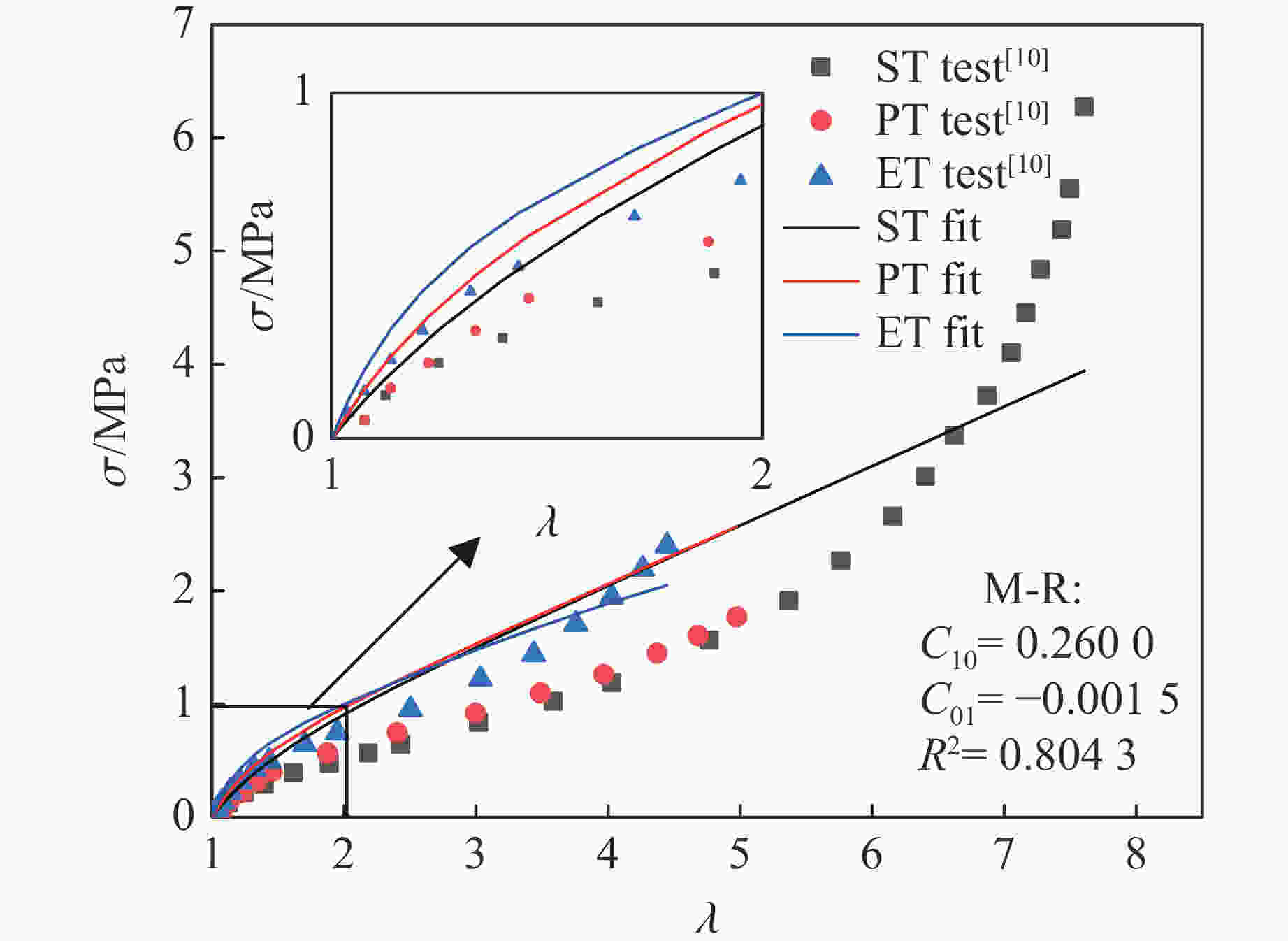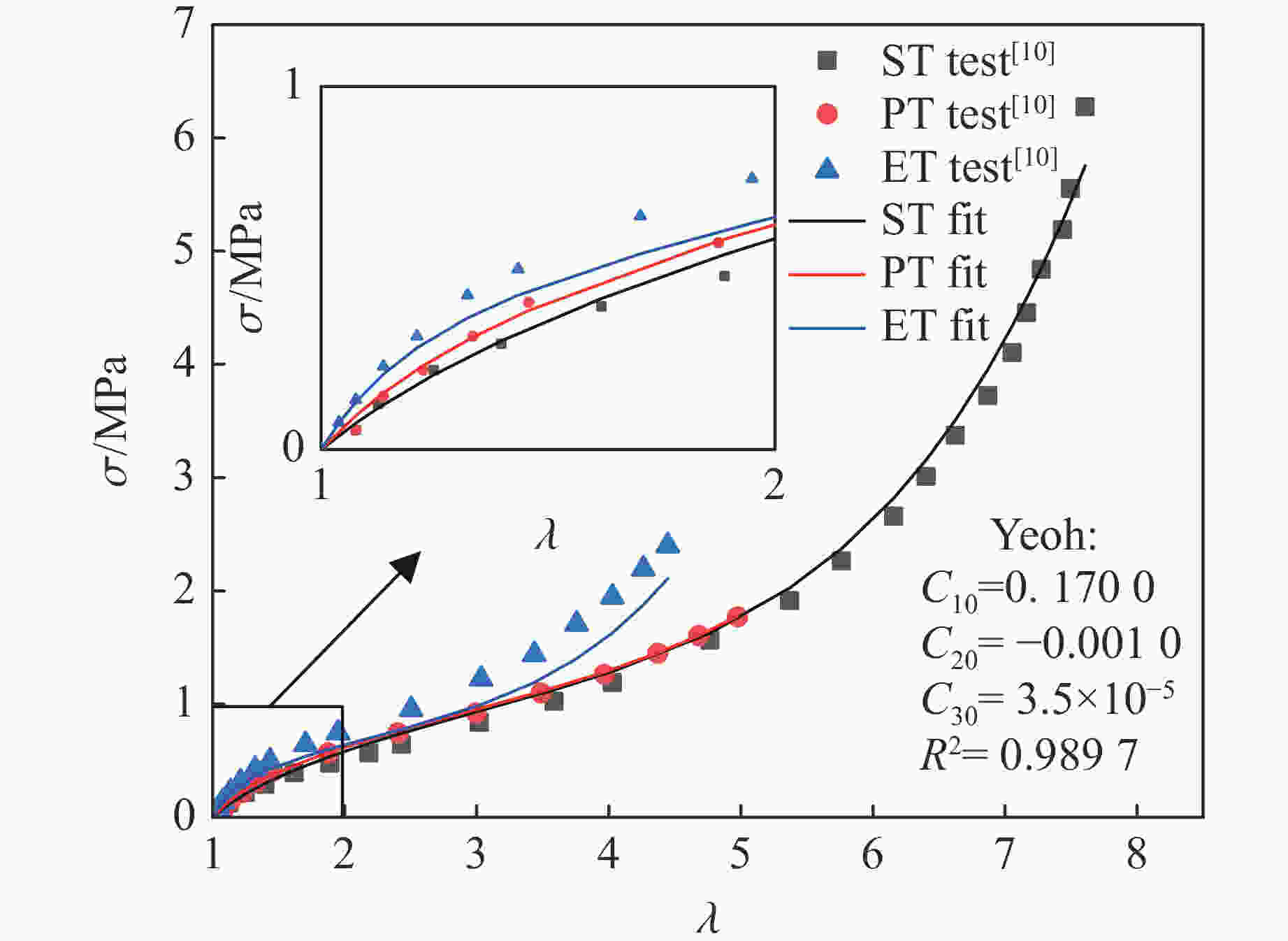 表 1 不同超弹性模型对 ST、PT 和 ET 实验数据的拟合效果比较
