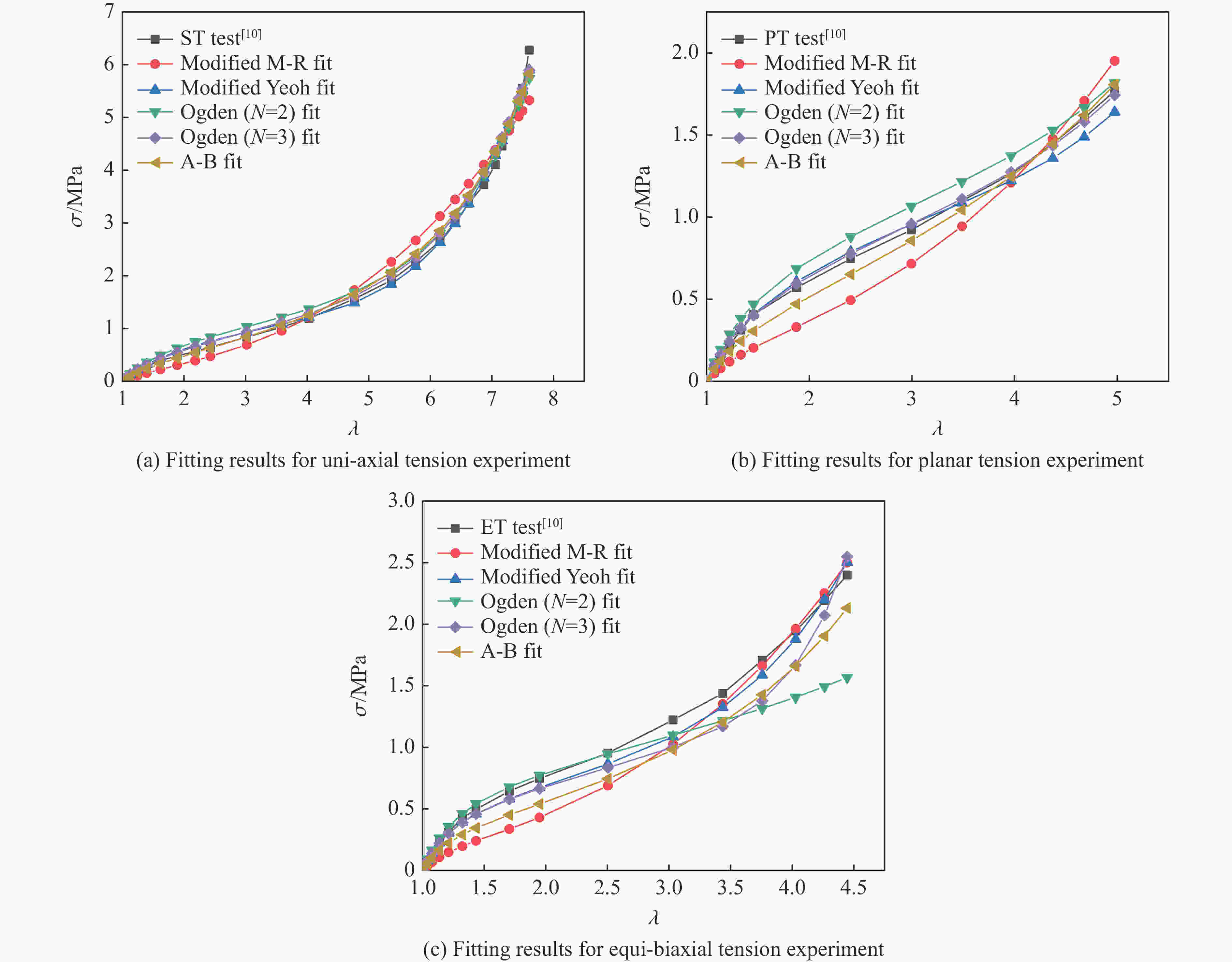 Table 1. Comparison of fitting results of different hyperelastic models on ST, PT and ET experimental data