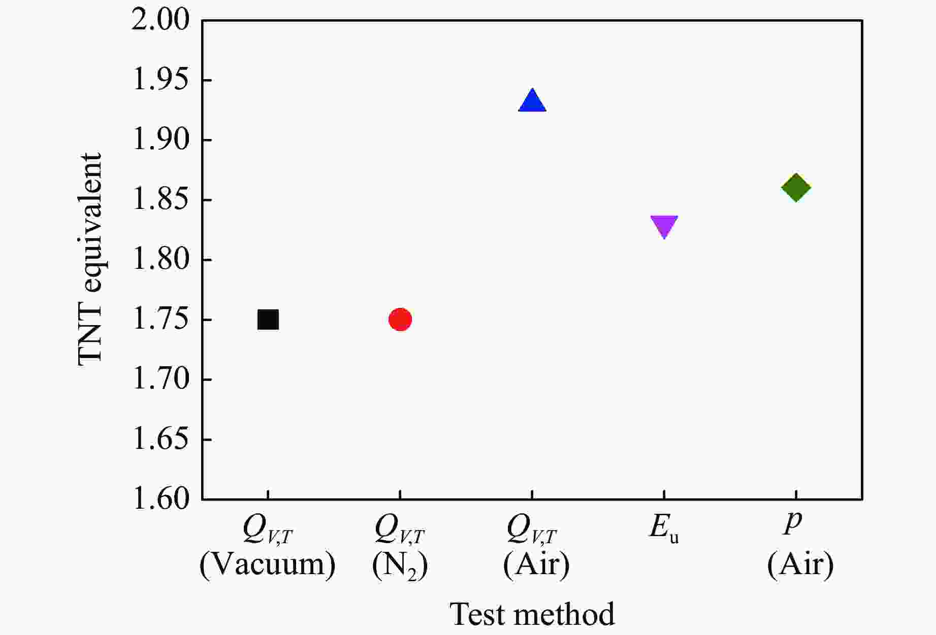Sample m/g Condition QV,T/(J·g−1) $\overline{{Q}} $V,T/(J·g−1) TNT equivalence TNT 20.1542 Vacuum 4160.542 4170.878 1.00 20.0216 Vacuum 4181.214 JHL-X 28.1652 Vacuum 7223.296 7301.088 1.75 28.1848 vacuum 7378.879 JHL-X 28.1792 N2, 0.1 MPa 7303.500 7308.060 1.75 28.1643 N2, 0.1 MPa 7312.620 JHL-X 28.1781 Air, 0.1 MPa 8017.592 8045.724 1.93 28.1824 Air, 0.1 MPa 8073.856 表 2 水下爆炸结果