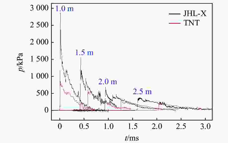 Sample pm/MPa $\theta $/$ {\text{μ}}{\rm{s}}$ Es/(kJ·g−1) T/s Eb/(kJ·g−1) Eu/(kJ·g−1) TNT equivalence TNT 5.472 57.6 0.762 0.131 2.268 3.030 1.00 JHL-X 6.013 74.2 0.888 0.141 4.580 5.468 1.80 JHL-X 5.945 70.8 0.968 0.142 4.678 5.646 1.86 JHL-X 5.705 78.1 0.950 0.141 4.585 5.535 1.83 Ave. (JHL-X) 5.888 74.4 0.935 0.141 4.614 5.550 1.83 表 3 TNT和JHL-X的超压