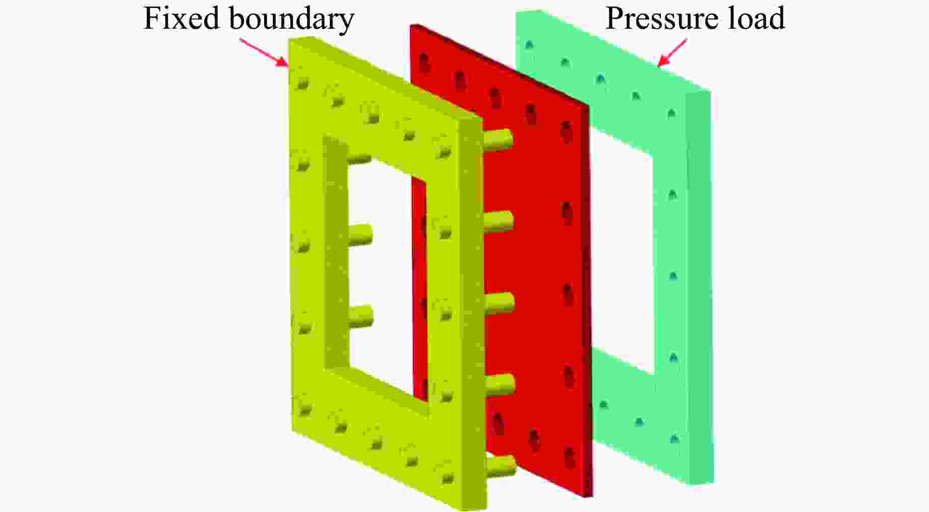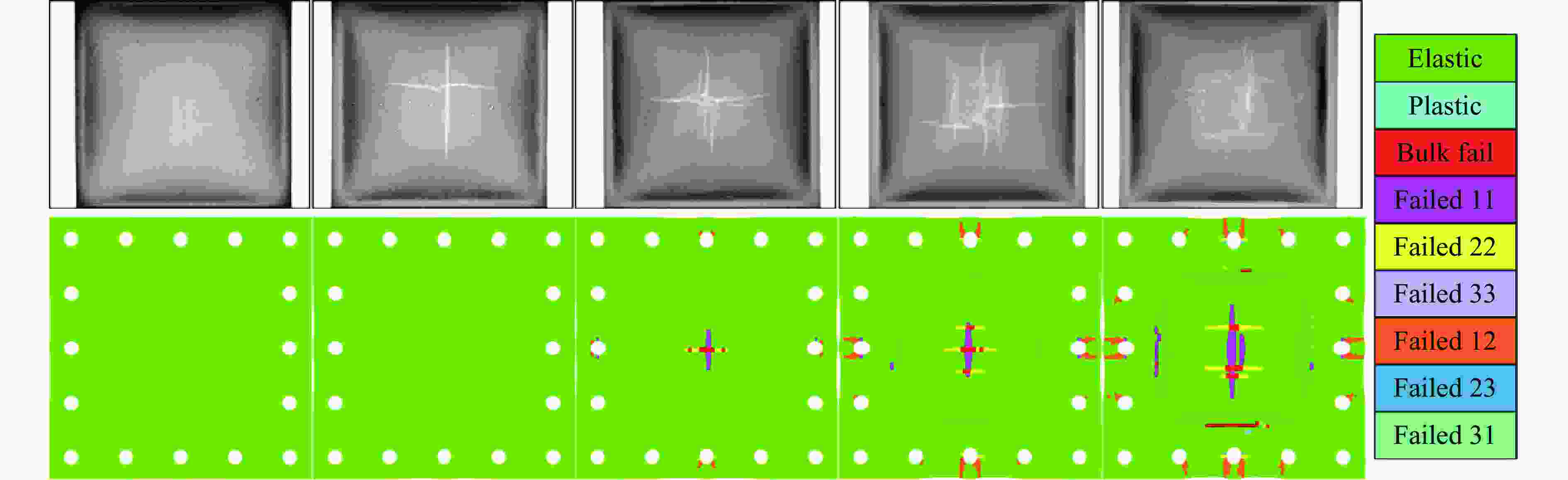 Equation of state Strength equation E11/GPa E22/GPa E33/GPa μ12 μ23 μ31 G/MPa 13.6 13.6 3.12 0.05 0.54 0.12 820 Failure criterion Post-failure mode σ11/MPa σ22/MPa σ33/MPa τ12/MPa τ23/MPa τ31/MPa Residual shear stiffness 550 550 550 220 220 220 0.2 Directional failure mode 11 22 33 12 23 31 11 only 22 only 33 only 12 and 11 only 23 and 11 only 31 and 11 only 表 10 夹持边界与固支边界对比
