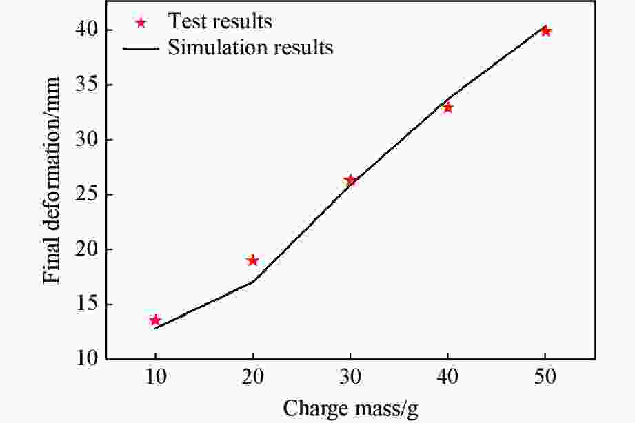 Specimen No. d/mm W/g δmax/mm A5G4-1 6.5 5 9.3 A5G4-2 6.5 10 13.5 A5G4-3 6.5 20 18.9 A5G4-4 6.5 30 26.2 A5G4-5 6.5 40 32.8 A5G4-6 6.5 50 39.7 表 3 药量递增下截面破坏形式变化
