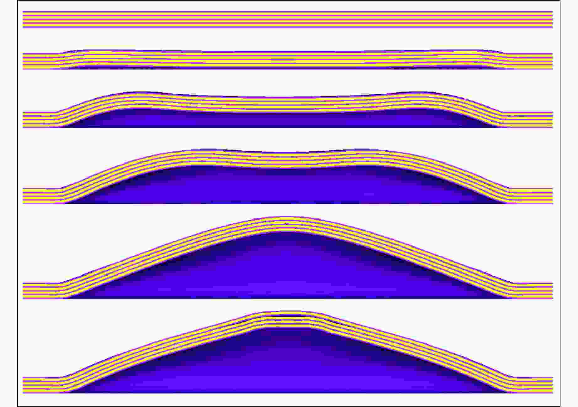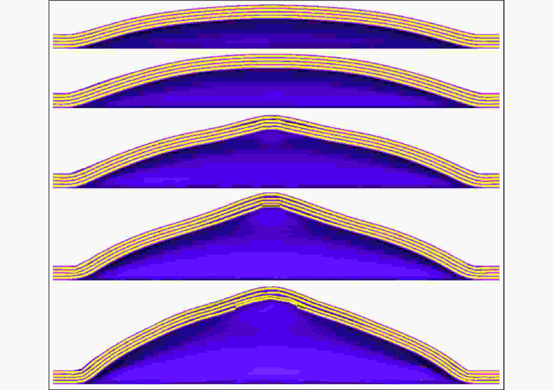 Specimen No. m/g d/mm W/g D/mm h/mm A5G4-1 1 108 6.5 5 15.0 17.8 A5G4-2 1 108 6.5 10 20.0 20.0 A5G4-3 1 108 6.5 20 25.0 25.6 A5G4-4 1 108 6.5 30 30.0 26.7 A5G4-5 1 108 6.5 40 30.0 35.6 A5G4-6 1 108 6.5 50 35.0 32.7 表 2 层合板试验变形数据
