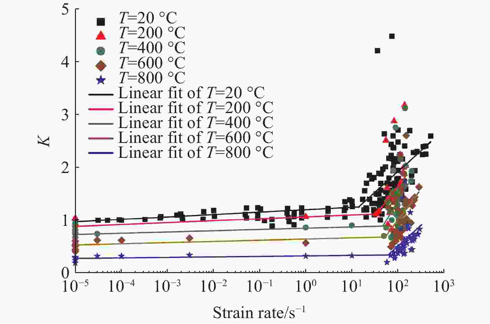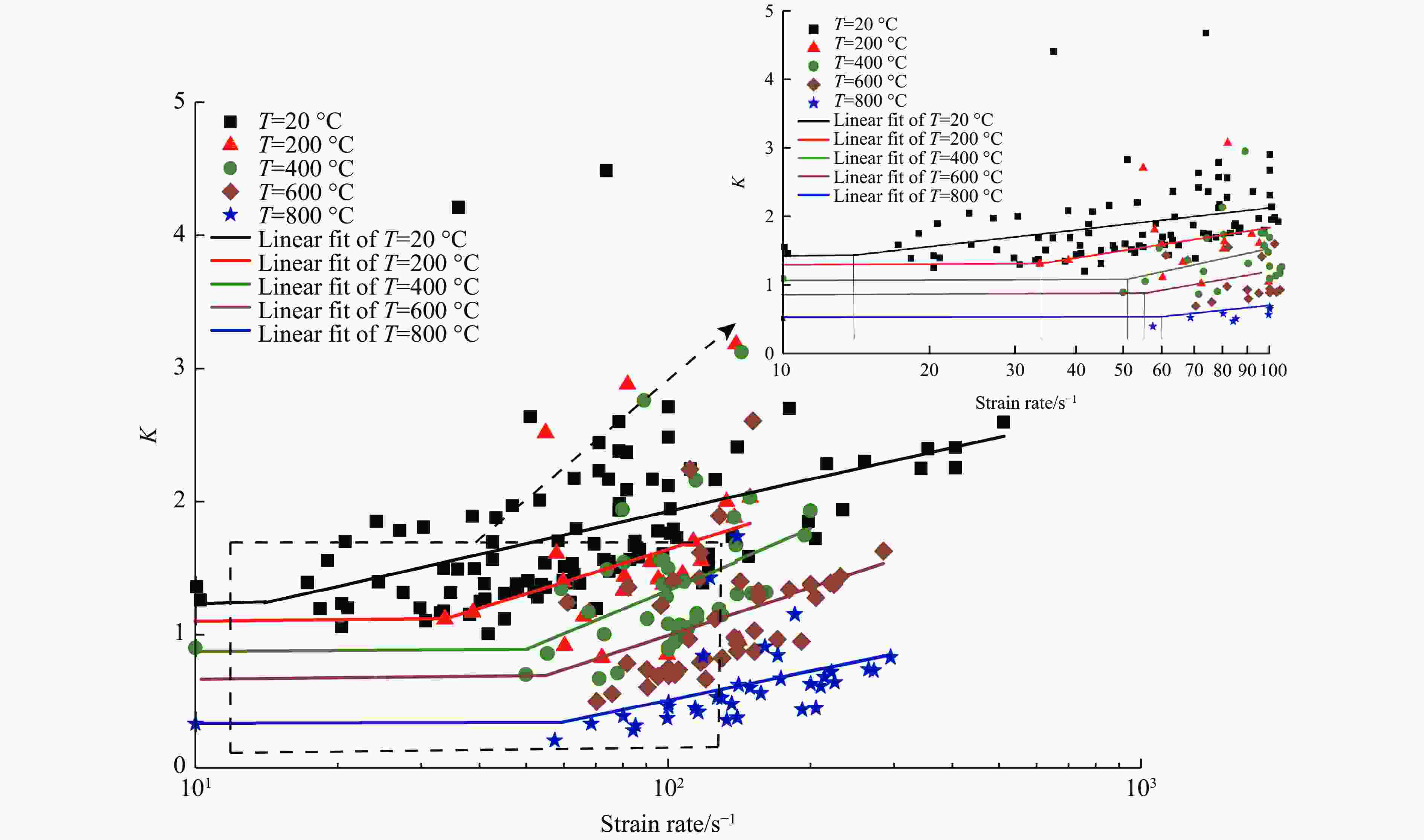 Figure  2.  Relationship of K-$ \dot{\varepsilon} $ of concrete at different temperatures and strain rates