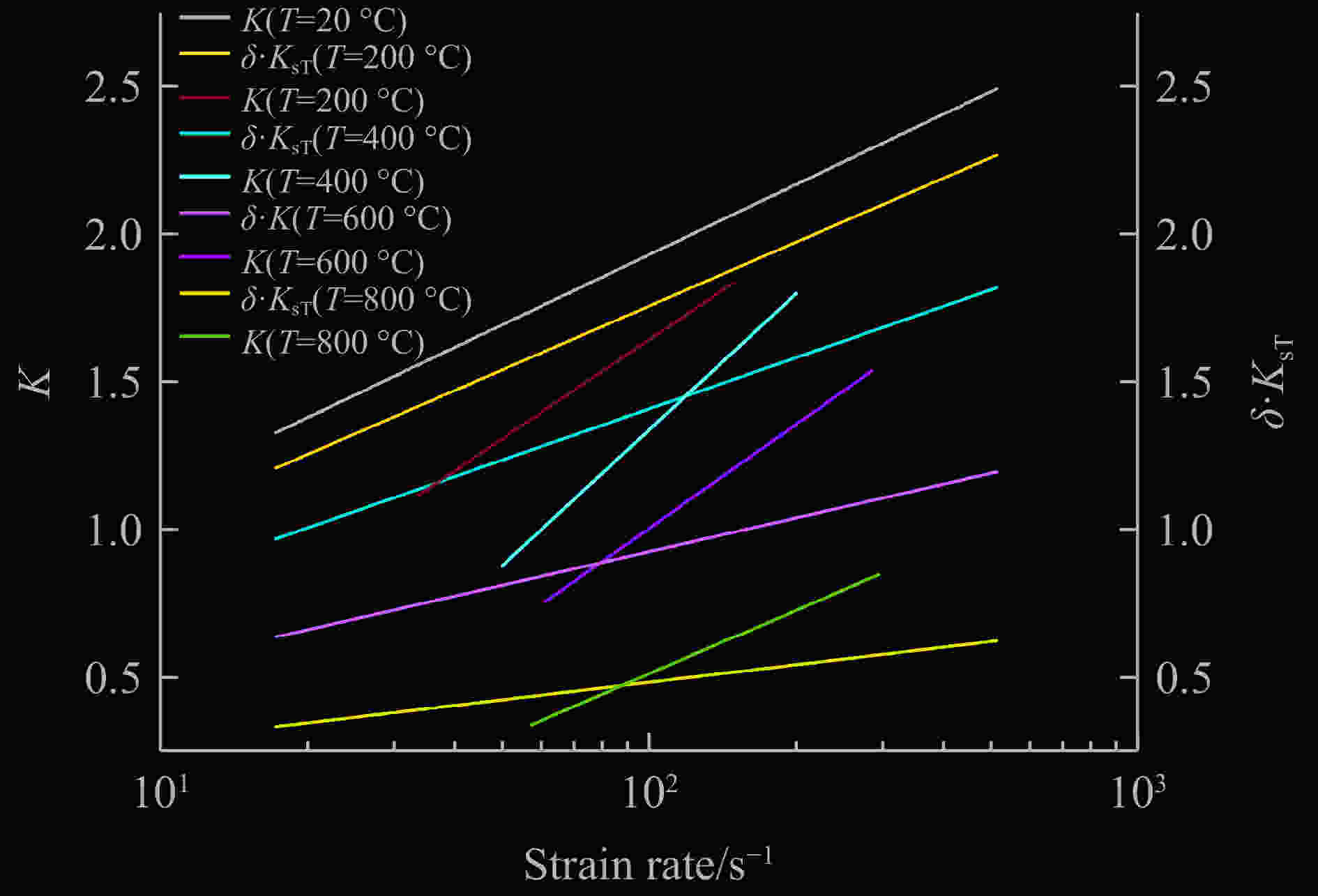 Figure  8.  Comparison of K-$\dot{\varepsilon} $ curves and $\delta $·KsT-$\dot{\varepsilon} $ curves at different temperatures