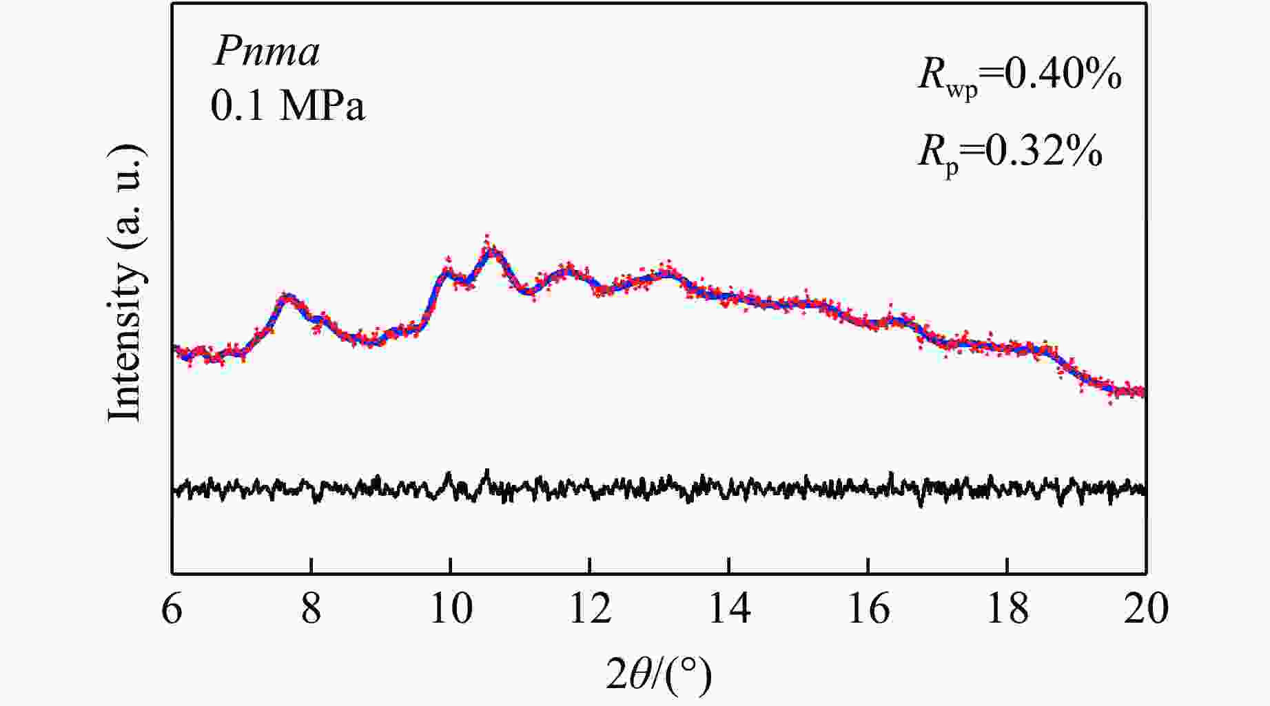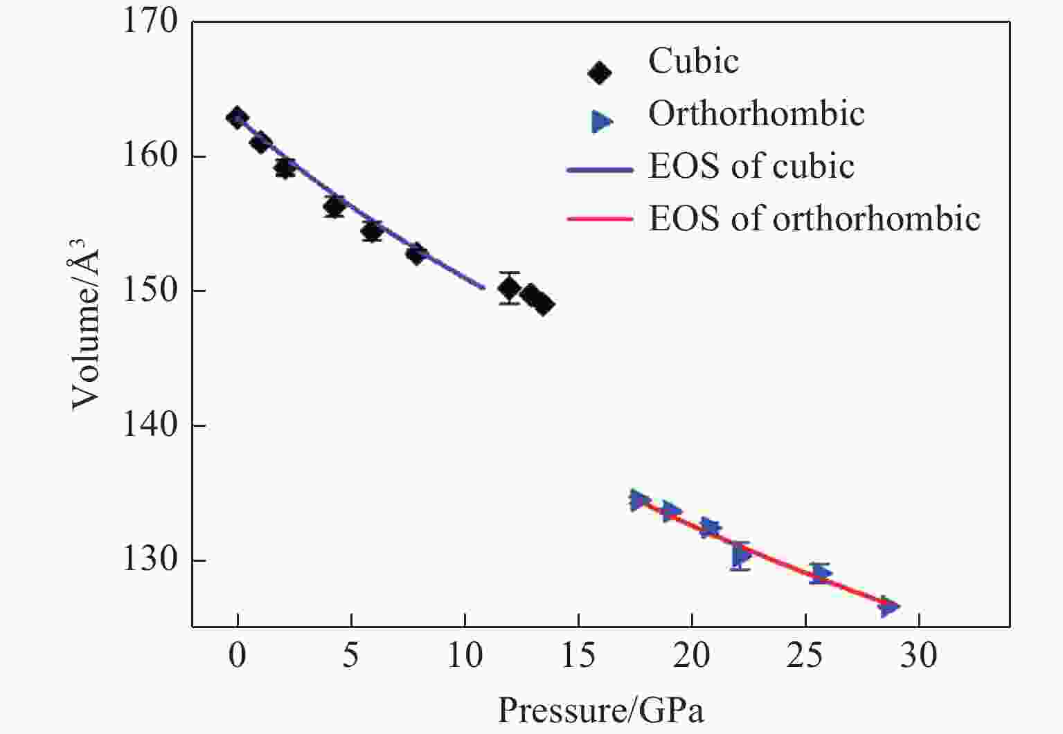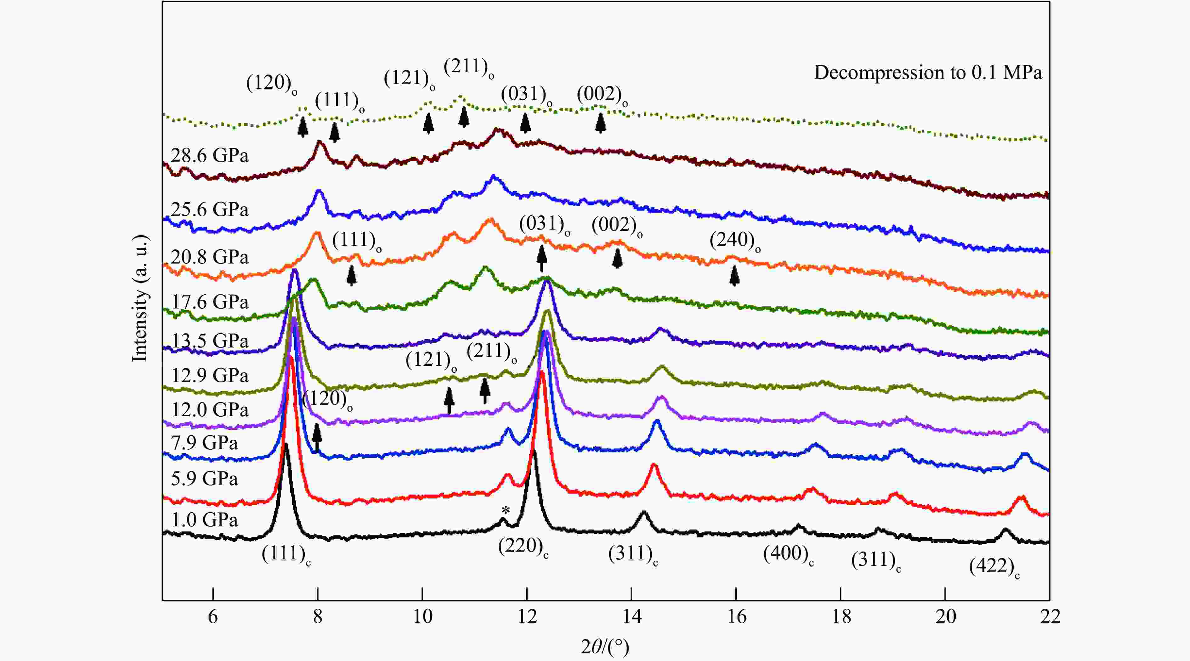 摘要: 利用原位高压同步辐射X射线衍射方法,对尺寸为11 nm的CaF2纳米晶粒进行高压结构相变和压缩特性研究。当压力为12 GPa时,观察到由萤石结构向 α-PbCl2结构转变的一次相变,该相变压力点远高于体材料,但略低于粒径更小的 CaF2 纳米晶体。相比体材料,纳米尺寸的CaF2样品的体弹模量更大,说明其更难被压缩。当压力释放至常压时,11 nm的CaF2纳米晶粒的α-PbCl2型亚稳相结构被保留下来,相变不可逆。分析了影响11 nm CaF2纳米晶粒独特高压行为的原因,判定尺寸效应为主要因素,该尺寸下较高的表面能导致结构稳定性增强和体积模量增加。Abstract: CaF2 nanocrystals with a size of 11 nm have been investigated using X-ray diffraction technique under high pressure. A phase transition from the fluorite structure to the α-PbCl2-type structure has been observed at 12 GPa, which is much higher than the value observed in the bulk CaF2 and slightly lower than the one in smaller-sized CaF2 nanocrystals. The compressibility of the CaF2 nanocrystals is discussed, an obviously higher incompressibility than the bulk CaF2 is observed. The α-PbCl2-type metastable phase is retained when the pressure is released to ambient conditions. The unique high-pressure behaviors of the 11 nm-sized CaF2 nanocrystals are attributed to defects and grain size effect. The grain size effect is considered to be the main factor influencing the high-pressure behaviors of the CaF2 nanocrystals. When the size of the CaF2 nanocrystals is as small as 11 nm, the higher surface energy leads to the enhancement of the structural stability and the increase of the bulk modulus.