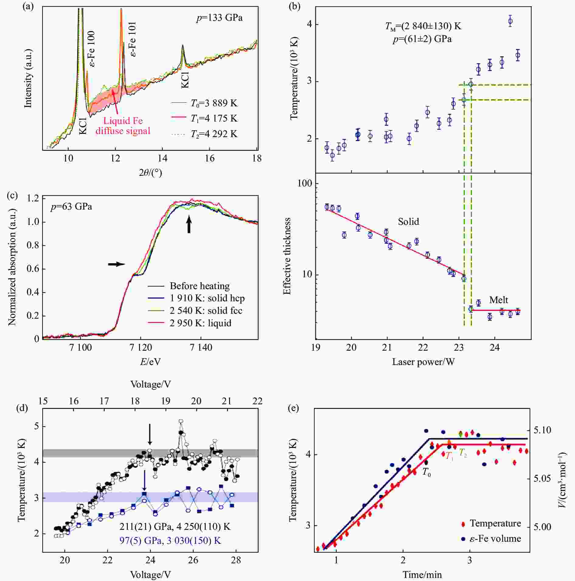 Figure 3. Some typical diagnostic methods and criteria used to study the melting behavior of iron at high pressures in heated DAC experiments: (a) XRD[10], (b) SMS[151], (c) XAS[154], (d) resistivity[155], (e) relationship between laser power and temperature[10]