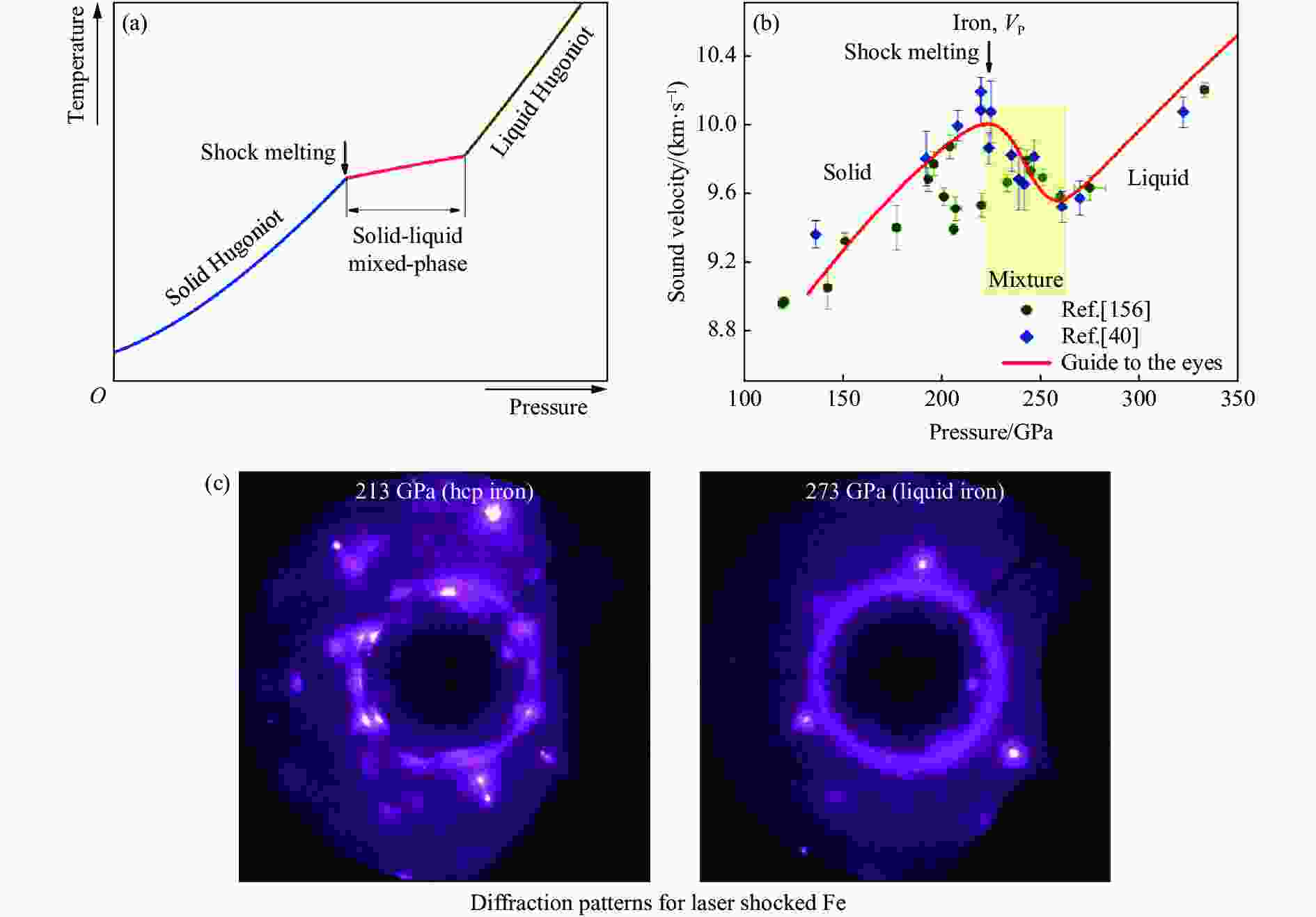 Figure 4. Typical diagnostics for the shock-induced melting in dynamic compression experiments[40, 120, 156]: (a) discontinuity of the relationship between shock pressure and Hugoniot temperature, (b) discontinuity of sound velocity along the Hugoniot, (c) the disappearance of XRD peak for hcp structure under shock loading[120]