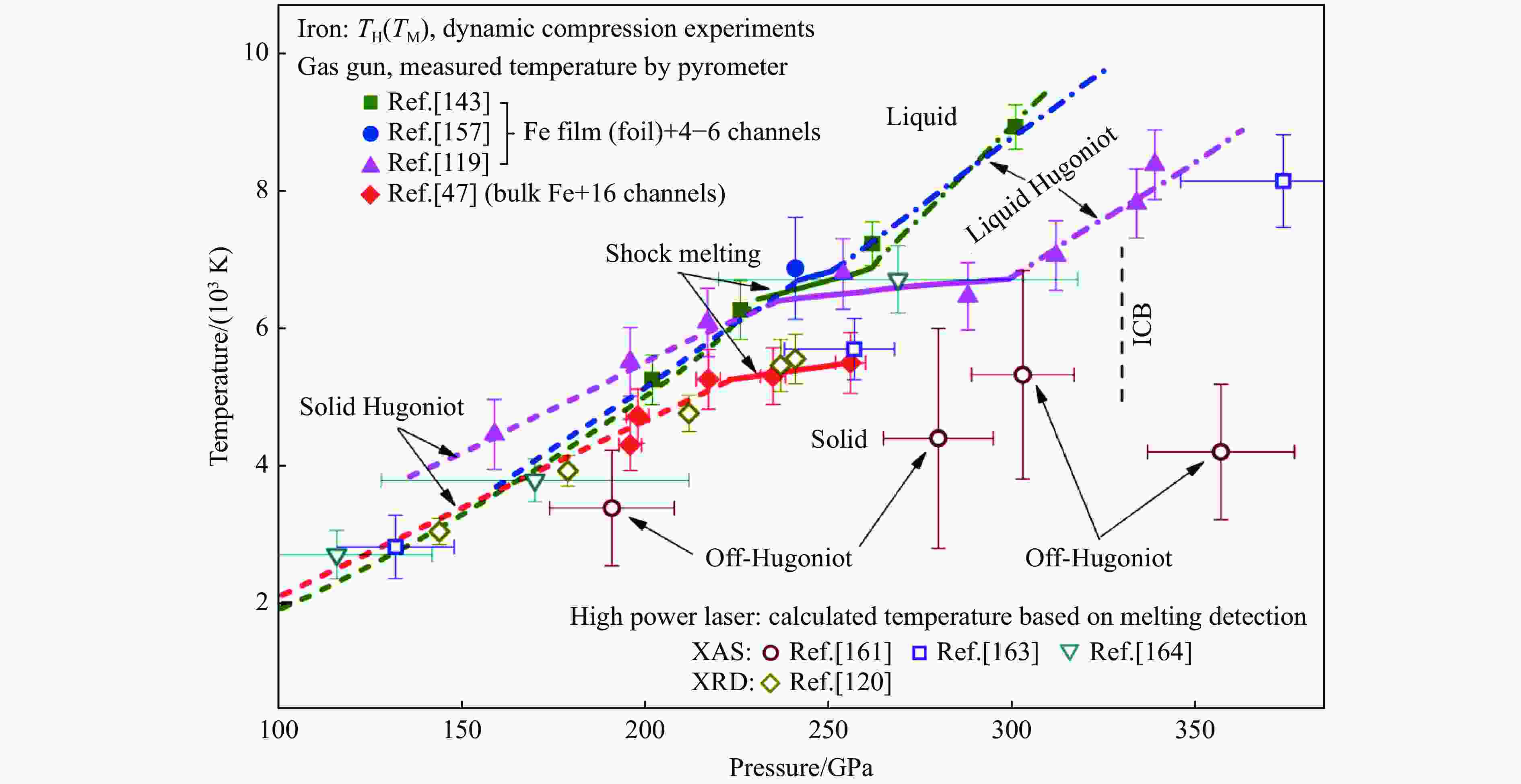 图 6 铁高压熔化温度的典型动高压实验研究结果[47, 119-120, 143, 157, 161, 163-164](实心图例表示采用多通道瞬态辐射高温计直接测得的铁的Hugoniot温度和熔化温度,其中绿色[143]、蓝色[157]和洋红色[119]图例代表使用微米厚铁膜或铁箔、4~6个波长通道的高温计测得的Hugoniot温度,红色图例[47]代表使用毫米厚块状铁、16个波长通道的高温计测得的Hugoniot温度;空心图例表示高功率激光加载动高压实验中采用XAS和XRD测得的铁的冲击熔化,通过热力学计算得到的Hugoniot温度)