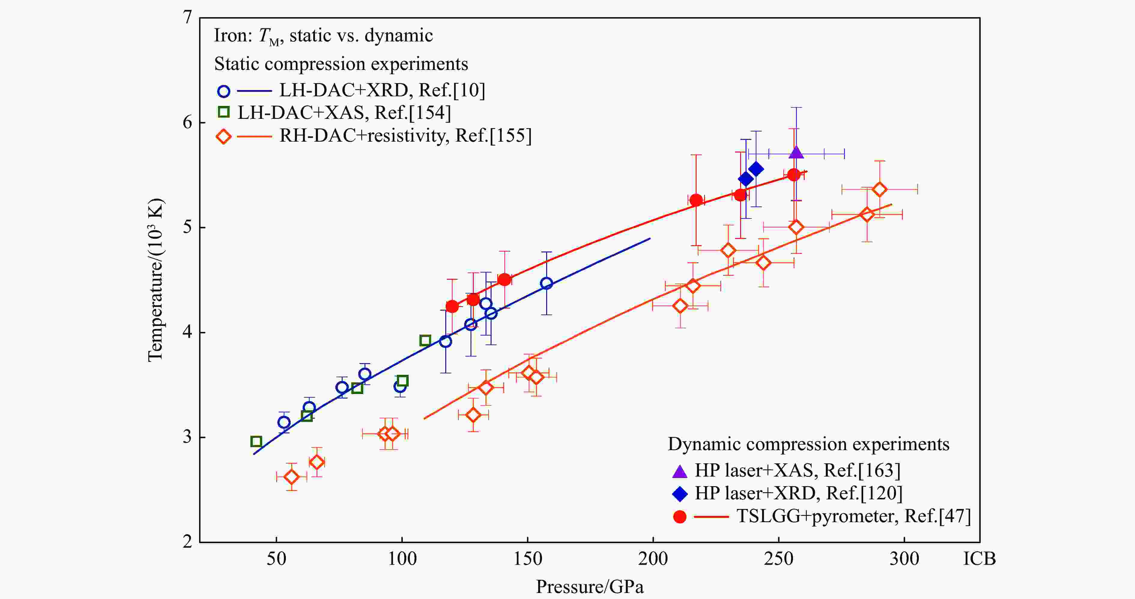 图 7 铁高压熔化温度的典型动高压和静高压实验结果对比[10, 47, 120, 154-155, 163](动高压实验结果与静高压实验结果具有良好的一致性,尤其是采用XAS[154]和XRD[10]作为诊断技术的LH-DAC静高压实验和改进样品靶结构并采用多通道瞬态辐射高温计[47]的动高压实验结果之间)