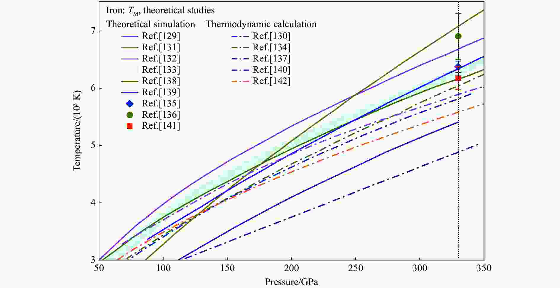 Figure 8. Melting temperatures of iron at high pressures using theoretical simulations and thermodynamic calculations[129-142] (Theoretical studies mainly include two categories: simulations based on molecular dynamics or first-principles and thermodynamic calculations based on thermodynamic parameters.)