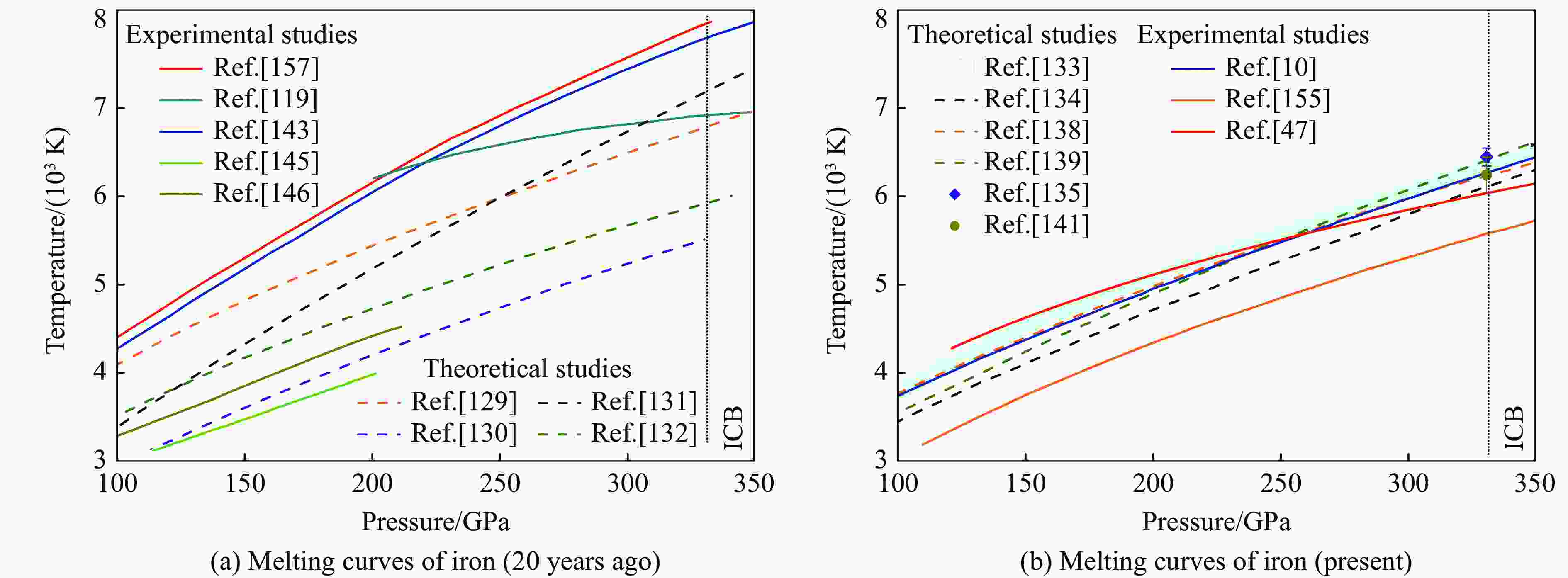 图 9 铁高压熔化线的典型研究结果[10, 47, 119, 129-135, 138-139, 141, 143, 145-146, 155, 157](20年前铁高压熔化线的实验与理论研究结果之间存在较大的差异,而目前实验与理论研究结果之间已经基本吻合)